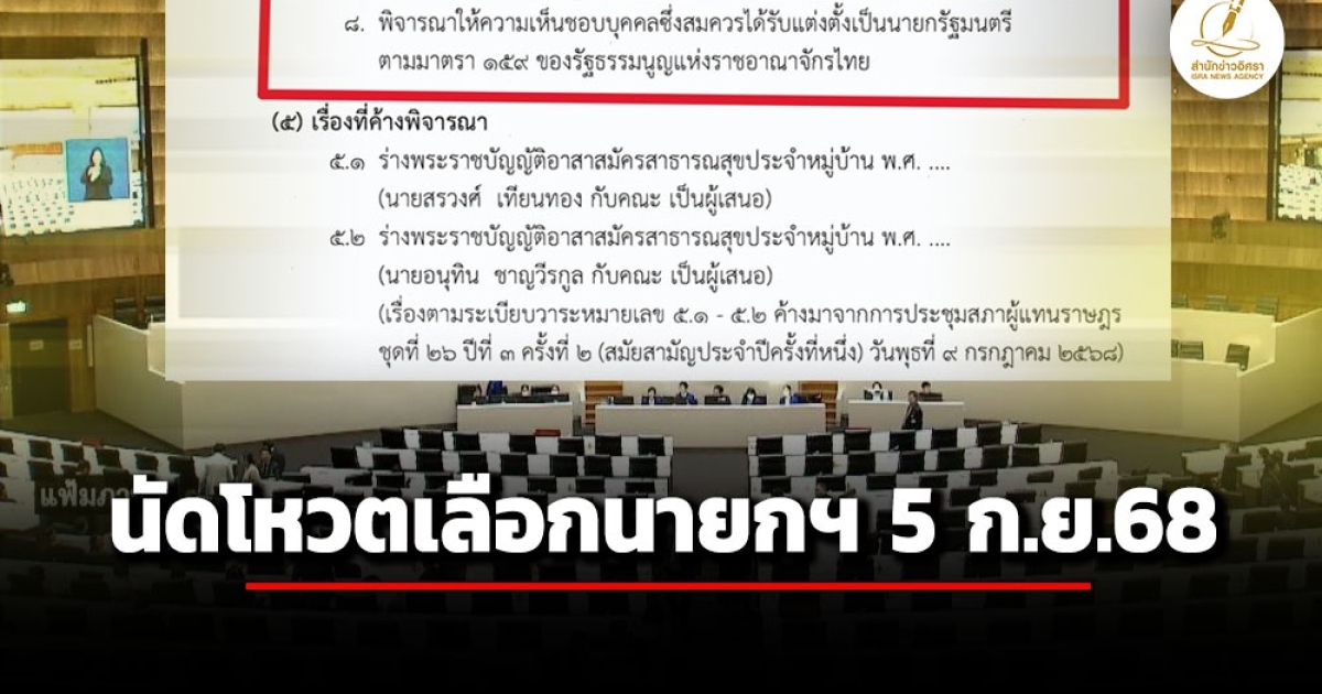 สำนักข่าวอิศรา (www.isranews.org) รายงานว่า วันที่ 3 กันยายน 2568 ว่าที่ ร.ต.ต.อาพัทธ์ สุขะนันท์ เลขาธิการสภาผู้แทนราษฎร ลงนามในหนังสือ ด่วนที่สุด ที่ สผ 0014/ผ 94 ถึงสมาชิกสภาผู้แทนราษฎร (สส.) แจ้งเรื่อง ระเบียบวาระการประชุมสภาผู้แทนราษฎร เพิ่มเติม เรื่องด่วนที่ 8 พิจารณาให้ความเห็นชอบบุคคลซึ่งสมควรได้รับแต่งตั้งเป็นนายกรัฐมนตรี ตามรัฐธรรมนูญ มาตรา 159 ในวันที่ 5 ก.ย.68 ทั้งนี้ ด้วยนายวันมูหะมัดนอร์ มะทา ประธานรัฐสภาและประธานสภาผู้แทนราษฎรได้มีคำสั่งให้บรรจุ