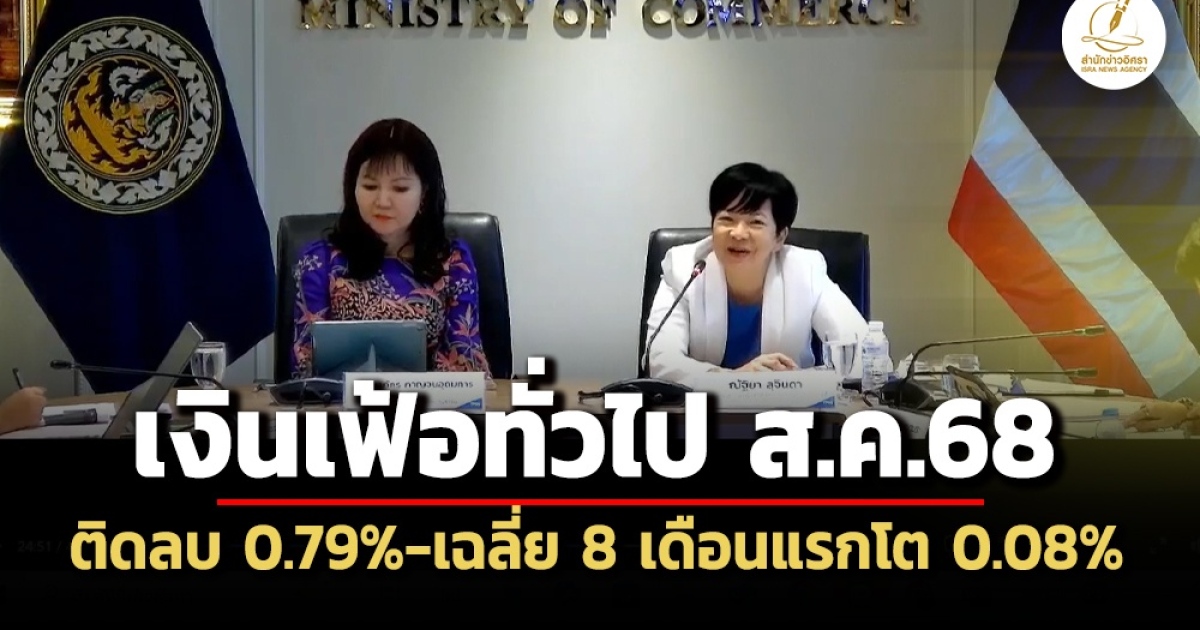 ‘พาณิชย์’ เผย ‘อัตราเงินเฟ้อทั่วไป’ ส.ค.68 ติดลบ 0.79% หดตัวต่อเนื่อง 5 เดือน จากปัจจัยราคา ‘อาหาร-พลังงาน’ ลดลง ส่งผลให้เฉลี่ย 8 เดือนแรก โตแค่ 0.08% มองยังไม่เข้าภาวะ ‘เงินฝืด’ เหตุ ‘Core CPI’ ยังเป็นบวกอยู่