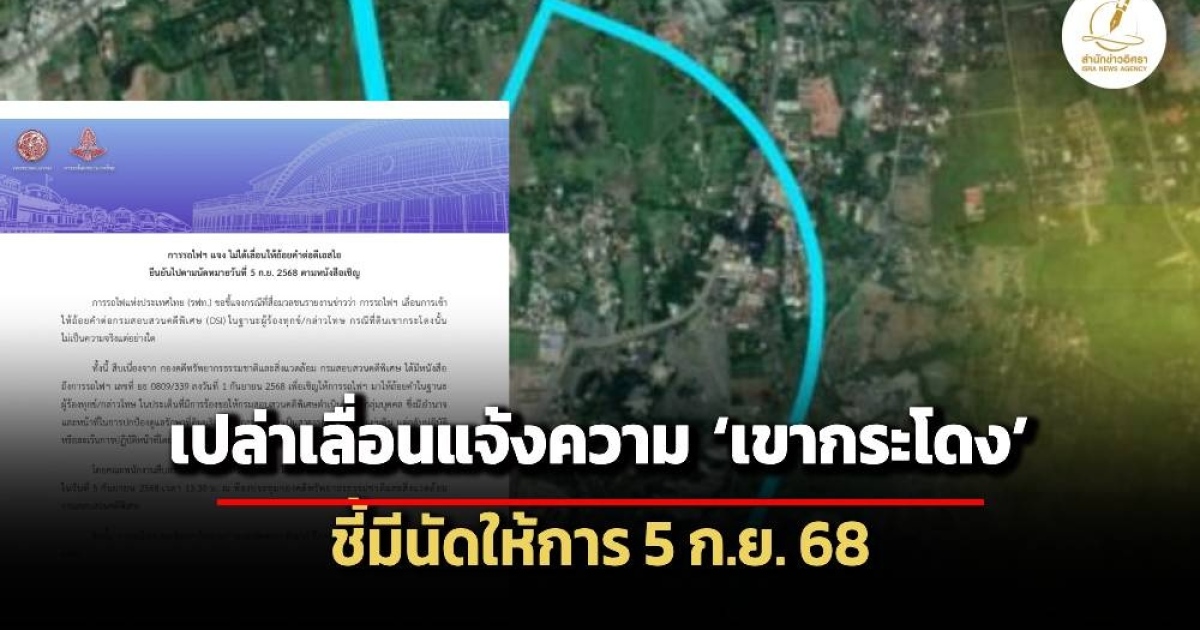 สำนักข่าวอิศรา (www.isranews.org) รายงานว่า วันที่ 4 กันยายน 2568 ศูนย์ประชาสัมพันธ์ การรถไฟแห่งประเทศไทย (รฟท.) เผยแพร่เอกสารข่าว ชี้แจงกรณีที่สื่อมวลชนรายงานข่าวว่า การรถไฟฯ เลื่อนการเข้าให้ถ้อยคำต่อกรมสอบสวนคดีพิพิเศษ (DSI) ในฐานะผู้ร้องทุกข์/กล่าวโทษ กรณีที่ดินเขากระโดงนั้น ไม่เป็นความจริงแต่อย่างใด