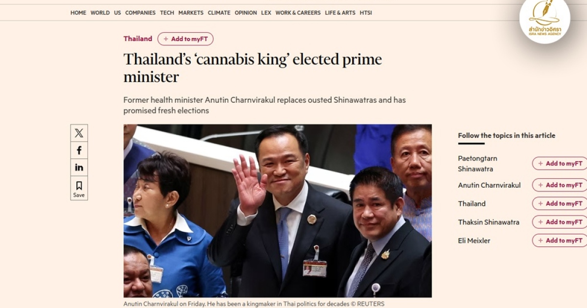 ไฟแนนเชียลไทม์สตีข่าว 'อนุทิน ชาญวีรกูล' นั่งนายกฯ คนที่ 32 ให้ฉายาโยงนโยบายกัญชา ชี้เป็นผู้มีบทบาทกำหนดตัวผู้นำไทยมานานนับสิบปี
