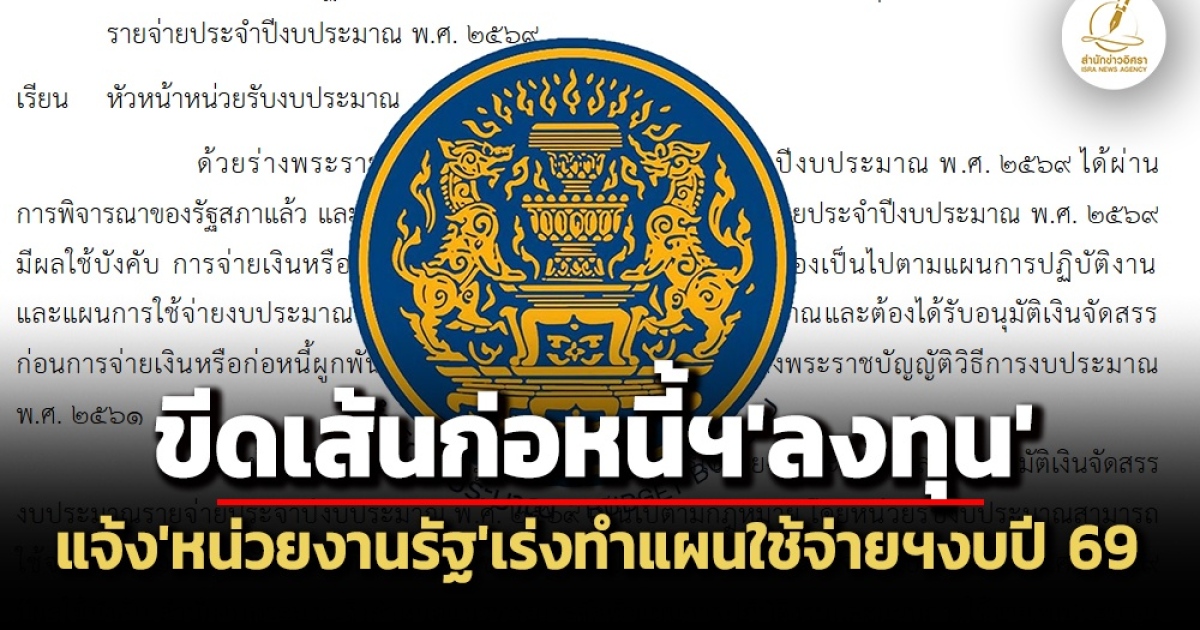 ‘สำนักงบประมาณ’ ร่อนหนังสือแจ้ง ‘หน่วยรับงบประมาณ’ จัดทำแผนปฏิบัติงาน-ใช้จ่ายงบปี 2569 เพื่อให้ใช้จ่าย-ก่อหนี้ผูกพันฯงบได้ทันที เมื่อ พ.ร.บ.งบปี 69 มีผลบังคับใช้ กำหนดให้ก่อหนี้ฯ ‘ลงทุน’ รายการปีเดียว ให้แล้วเสร็จภายใน มี.ค.69
