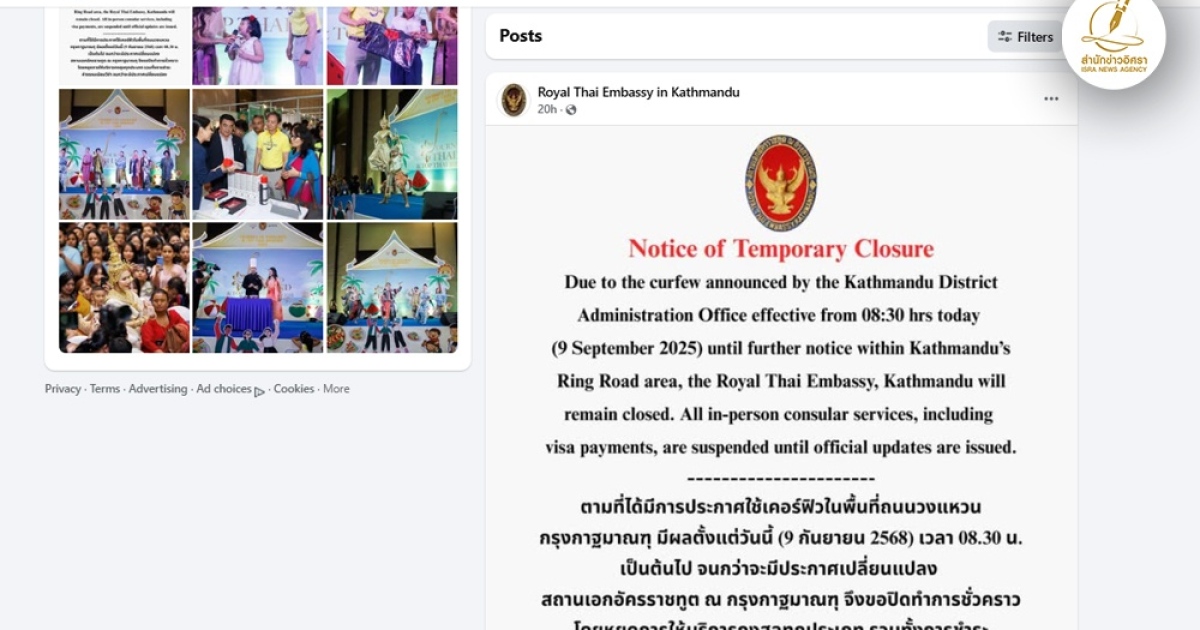 ต่อมา สถานเอกอัครราชทูต ณ กรุงกาฐมาณฑุ โพสต์แจ้งว่า ตามที่ได้มีการประกาศใช้เคอร์ฟิว ในพื้นที่ถนนวงแหวนกรุงกาฐมาณฑุ มีผลตั้งแต่วันที่ 9 ก.ย.68 เวลา 08.30 น.เป็นต้นไป จนกว่าจะมีประกาศเปลี่ยนแปลง สถานเอกอัครราชทูต ณ กรุงกาฐมาณฑุ จึงขอปิดทำการชั่วคราว โดยหยุดให้บริการกงสุลทุกประเภท รวมทั้งการชำระค่าธรรมเนียมวีซ่า จนกว่าจะมีประกาศเปลี่ยนแปลง