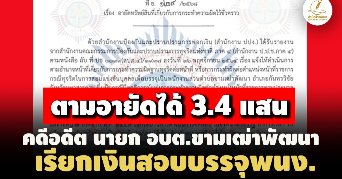 ปปง.สั่งอายัดทรัพย์ คดี ‘อภิชาติ วงษ์อาษา’ อดีตนายก อบต. ขามเฒ่าพัฒนา อ.กันทรวิชัย จ.มหาสารคาม กับพวก ทุจริตสอบแข่งขันบุคคลบรรจุเขาเป็นพนักงานอบต. ปี 2557 ได้เงินฝาก 10 บัญชี 3.4 แสนบาท ชื่อ‘ยุทธเดช’ ถือครอง