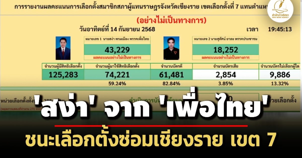 สำนักข่าวอิศรา (www.isranews.org) รายงานว่า วันที่ 14 กันยายน 2568 สำนักงานคณะกรรมการการเลือกตั้ง (กกต.) จัดการเลือกตั้งซ่อม สส.เชียงราย เขต 7 ภายหลังปิดหีบลงคะแนนเมื่อเวลา 17.00 น. ผลการนับคะแนนอย่างไม่เป็นทางการปรากฏว่า นายสง่า พรมเมือง ผู้สมัครหมายเลข 1 จากพรรคเพื่อไทย มีคะแนนนำเป็นอันดับ 1 ด้วยคะแนน 43,229 คะแนน ขณะที่นายสุทัศน์ ยาละ ผู้สมัครหมายเลข 2 จากพรรคประชาชน มีคะแนนตามมาเป็นอันดับ 2 ด้วยคะแนน 18,252 คะแนน