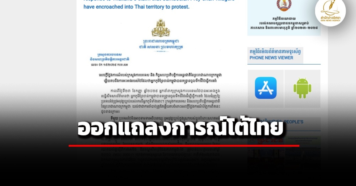 สำนักข่าวอิศรา (www.isranews.org) รายงานว่าเมื่อวันที่ 24 ก.ย.กระทรวงต่างประเทศกัมพูชาได้ออกแถลงการณ์ตอบโต้ทางการไทยที่กล่าวหาว่าชาวกัมพูชารุกล้ำดินแดนไทย เนื้อหาระบุว่า