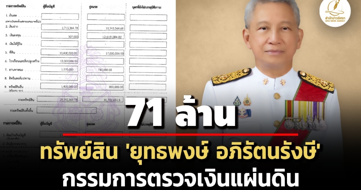 ป.ป.ช. เปิดทรัพย์สินผู้ดำรงตำแหน่งระดับสูง 'ยุทธพงษ์ อภิรัตนรังษี' กรรมการตรวจเงินแผ่นดิน ทรัพย์สิน 71 ล. รายได้ 5 ล./ปี