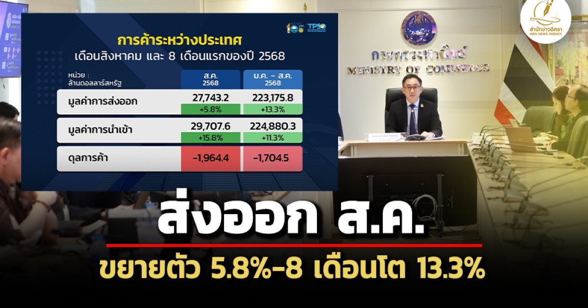 ‘พาณิชย์’ เผยส่งออกไทย ส.ค.68 ขยายตัว 5.8% โตต่อเนื่อง 14 เดือน หลัง ‘ภาษีสหรัฐ’ มีผลตั้งแต่ต้น ส.ค. ขณะที่ 8 เดือนแรก เติบโต 13.3%