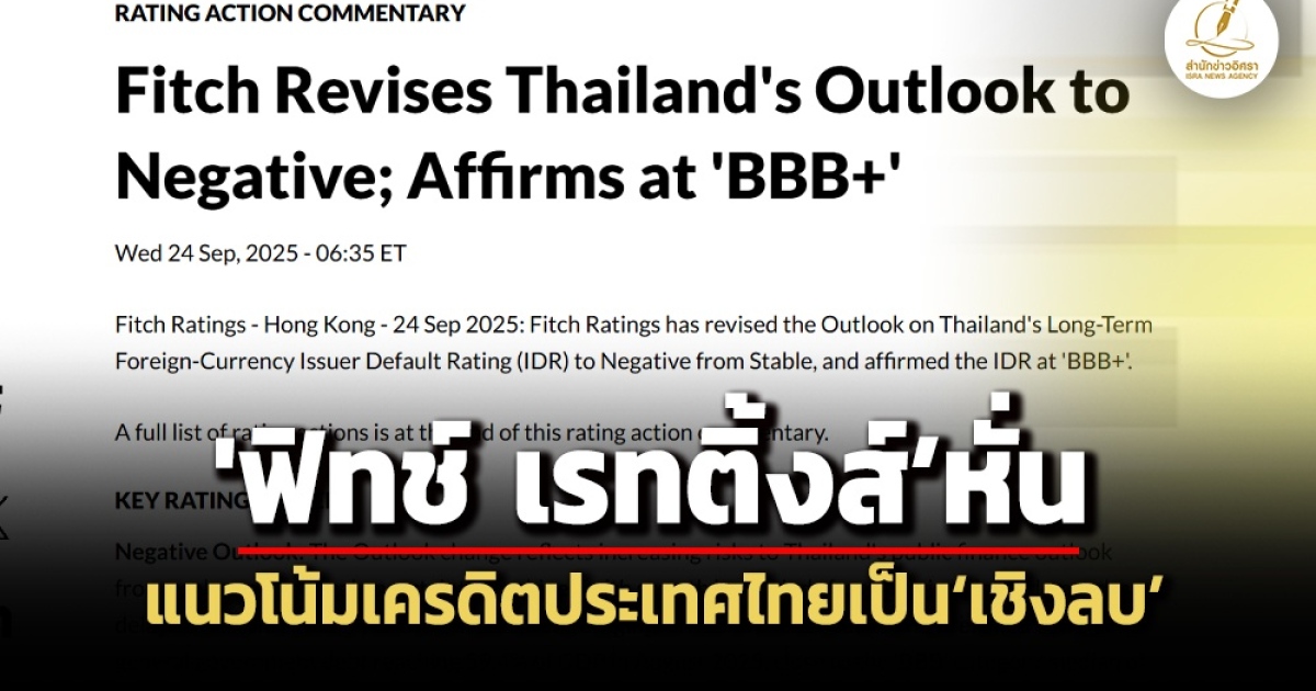 สำนักข่าวอิศรา (www.isranews.org) รายงานว่าเมื่อวันที่ 24 ก.ย.บริษัท ฟิทช์ เรทติ้งส์ อิงค์ เป็นหน่วยงานจัดอันดับเครดิตของสหรัฐอเมริกา เป็นหนึ่งในสามองค์กรจัดอันดับทางสถิติที่ได้รับการยอมรับในระดับประเทศ ซึ่งแต่งตั้งโดยสำนักงานคณะกรรมการกำกับหลักทรัพย์และตลาดหลักทรัพย์แห่งสหรัฐอเมริกาไดมีการจัดแนวโน้มอันดับเครดิตสากลสกุลเงินต่างประเทศระยะยาว (IDR) ของประเทศไทยเป็นลบจากเดิมที่ประเทศไทยมีสเถียรภาพ และคงอันดับเครดิตสากลสกุลเงินต่างประเทศระยะยาวที่ 'BBB+' โดยหนี้สาธารณะของไทยแตะ 59.4% ต่อ GDP ในเดือนสิงหาคม 2568 ใกล้ระดับค่าเฉลี่ยของประเทศกลุ่ม BBB อย่างไรก็ตามอัตราหนี้สาธารณะต่อ GDP ของไทยมีแนวโน้มสูงกว่าประเทศที่มีอันดับเครดิตใกล้เคียง และรายได้จากภาษียังต่ำกว่าศักยภาพ ในขณะที่มีค่าใช้จ่ายเพื่อสวัสดิการและกระตุ้นเศรษฐกิจเพิ่มขึ้น