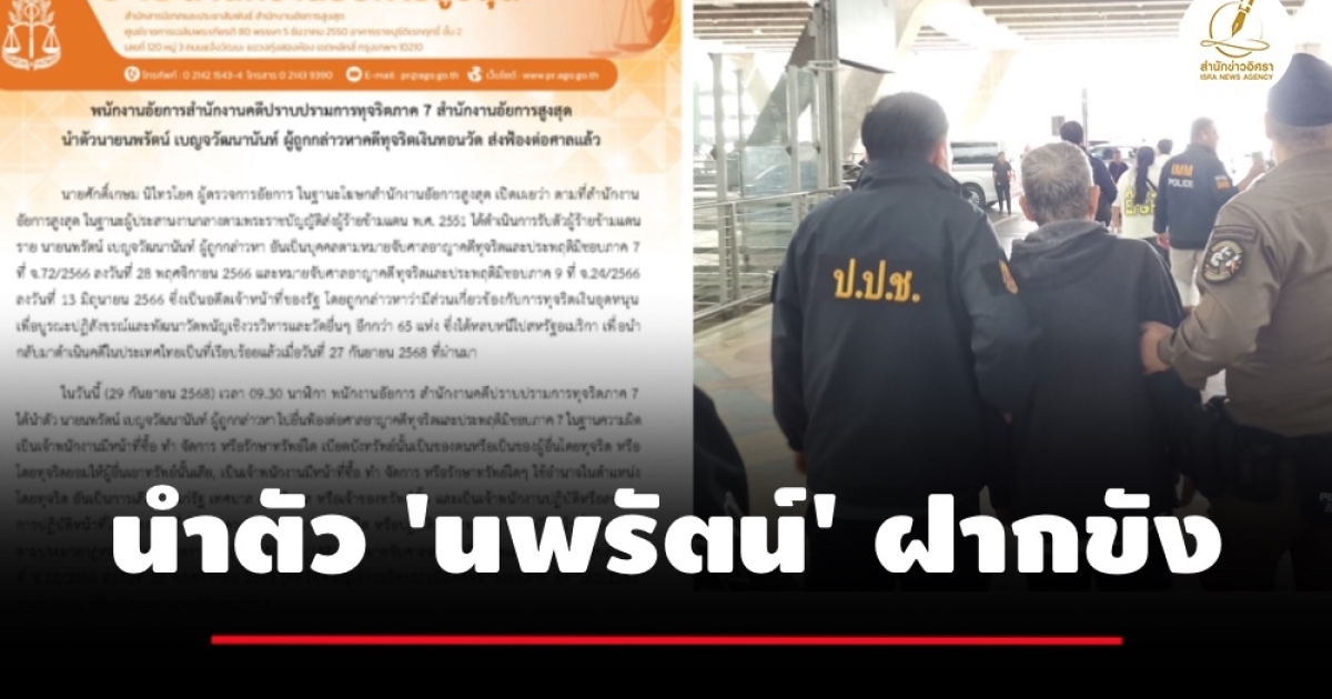 สำนักข่าวอิศรา (www.isranews.org) รายงานว่า เมื่อวันที่ 29 ก.ย. 2568 นายศักดิ์เกษม นิไทรโยค ผู้ตรวจการอัยการ ในฐานะโฆษกสำนักงานอัยการสูงสุด เปิดเผยว่า ตามที่สำนักงานอัยการสูงสุด ในฐานะผู้ประสานงานกลางตาม พรบ.ส่งผู้ร้ายข้ามแดน พ.ศ. 2551 ได้ดำเนินการรับตัวผู้ร้ายข้ามแดนราย นายนพรัตน์ เบญจวัฒนานันท์ อดีตผ.อ.สำนักพุทธฯ ผู้ถูกกล่าวหา อันเป็นบุคคลตามหมายจับศาลอาญาคดีทุจริตและประพฤติมิชอบภาค 7 ที่ จ.72/2566 ลงวันที่ 28 พ.ย. 2566 และหมายจับศาลอาญาคดีทุจริตและประพฤติมิชอบภาค 9 ที่ จ.24/2566 ลงวันที่ 13 มิ.ย. 2566 ซึ่งเป็นอดีตเจ้าหน้าที่ของรัฐ โดยถูกกล่าวหาว่ามีส่วนเกี่ยวข้องกับการทุจริตเงินอุดหนุนเพื่อบูรณะปฏิสังขรณ์และพัฒนาวัดพนัญเชิงวรวิหารและวัดอื่นๆ อีกกว่า 65 แห่ง ซึ่งได้หลบหนีไปสหรัฐอเมริกา เพื่อนำกลับมาดำเนินคดีในประเทศไทยเป็นที่เรียบร้อยแล้วเมื่อวันที่ 27 ก.ย. 2568 ที่ผ่านมา