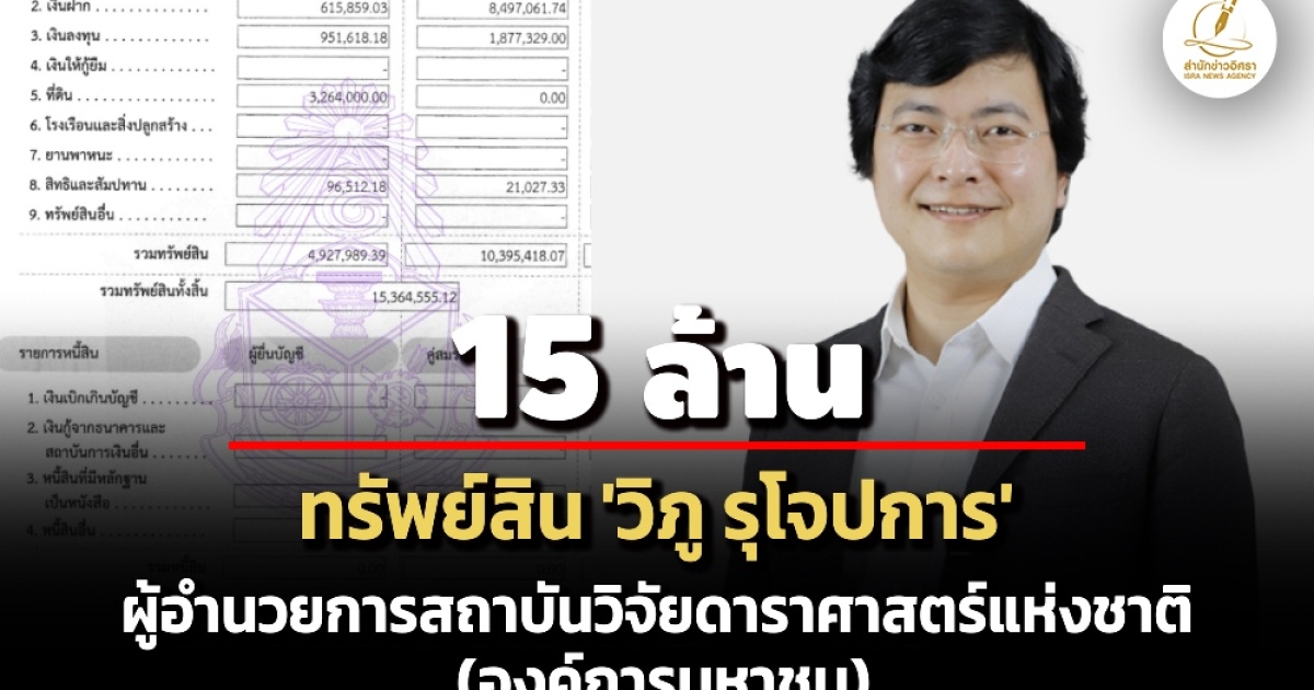 สำนักข่าวอิศรา (www.isranews.org) รายงานว่า เมื่อเร็ว ๆ นี้ สำนักงานคณะกรรมการการป้องกันและปราบการทุจริตแห่งชาติ (ป.ป.ช.) เปิดเผยบัญชีแสดงรายการทรัพย์สินและหนี้สินผู้ดำรงตำแหน่งระดับสูง ราย นายวิภู รุโจปการ ผู้อำนวยการสถาบันวิจัยดาราศาสตร์แห่งชาติ (องค์การมหาชน) กรณีเข้ารับตำแหน่ง เมื่อวันที่ 1 ส.ค. 2568