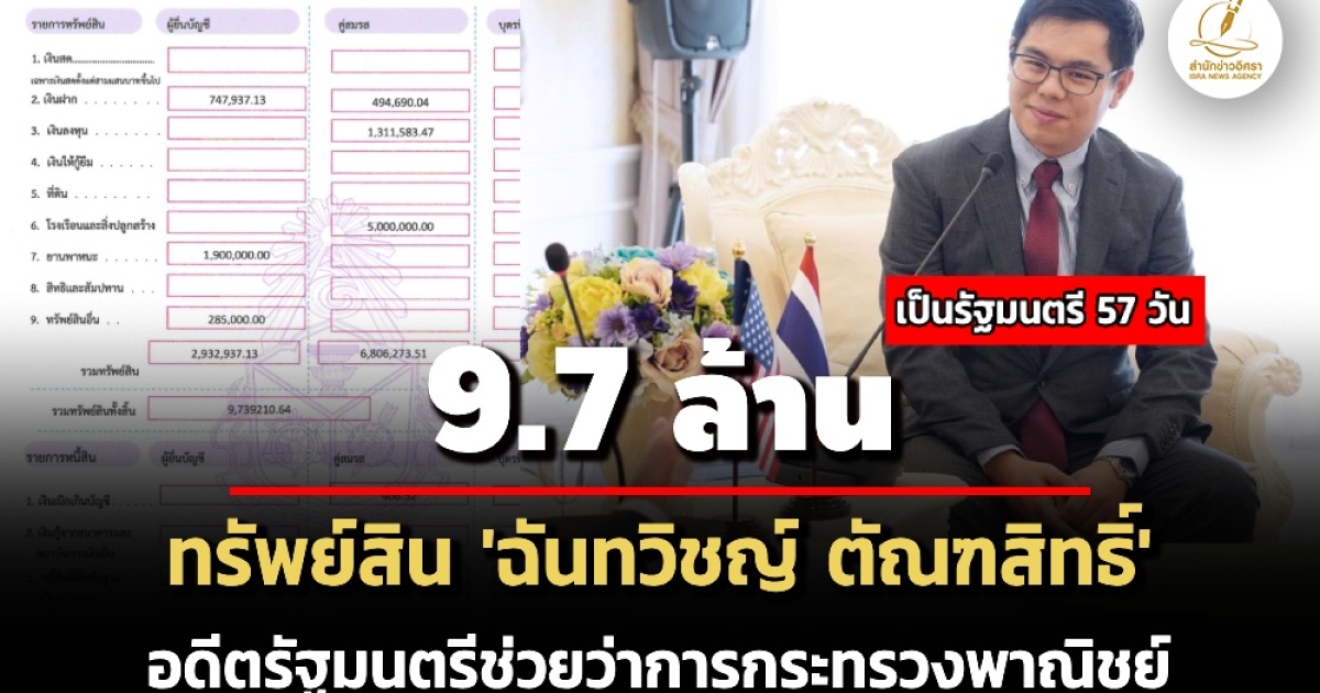 ป.ป.ช. เปิดทรัพย์สินผู้ดำรงตำแหน่งรัฐมนตรี 'ฉันทวิชญ์ ตัณฑสิทธิ์' อดีตรัฐมนตรีช่วยว่าการกระทรวงพาณิชย์ 57 วัน ทรัพย์สิน 9.7 ล. รายได้ 1.3 ล./ปี