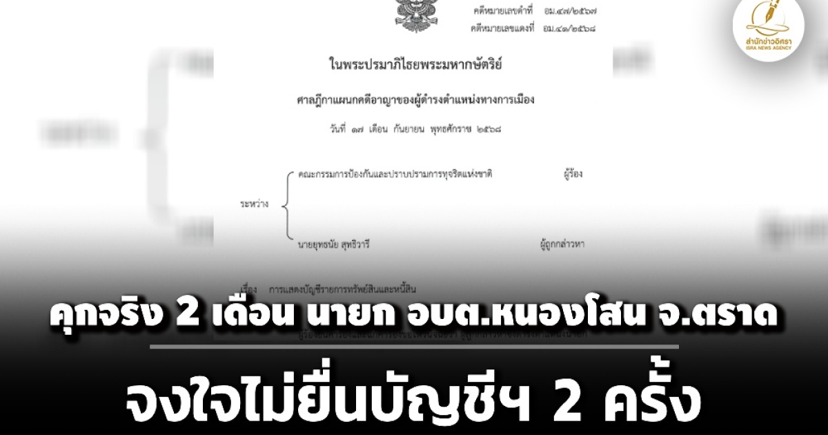 ศาลฎีกาฯพิพากษา ‘ยุทธนัย สุทธิวารี’ นายก อบต.หนองโสน จ.ตราด จงใจไม่ยื่นบัญชีทรัพย์สิน 2 ครั้ง ให้เพิกถอนสิทธิสมัครรับเลือกตั้งตลอดชีพ จำคุก 2 เดือน นับโทษต่อจากคดีอาญาศาลจังหวัดตราด