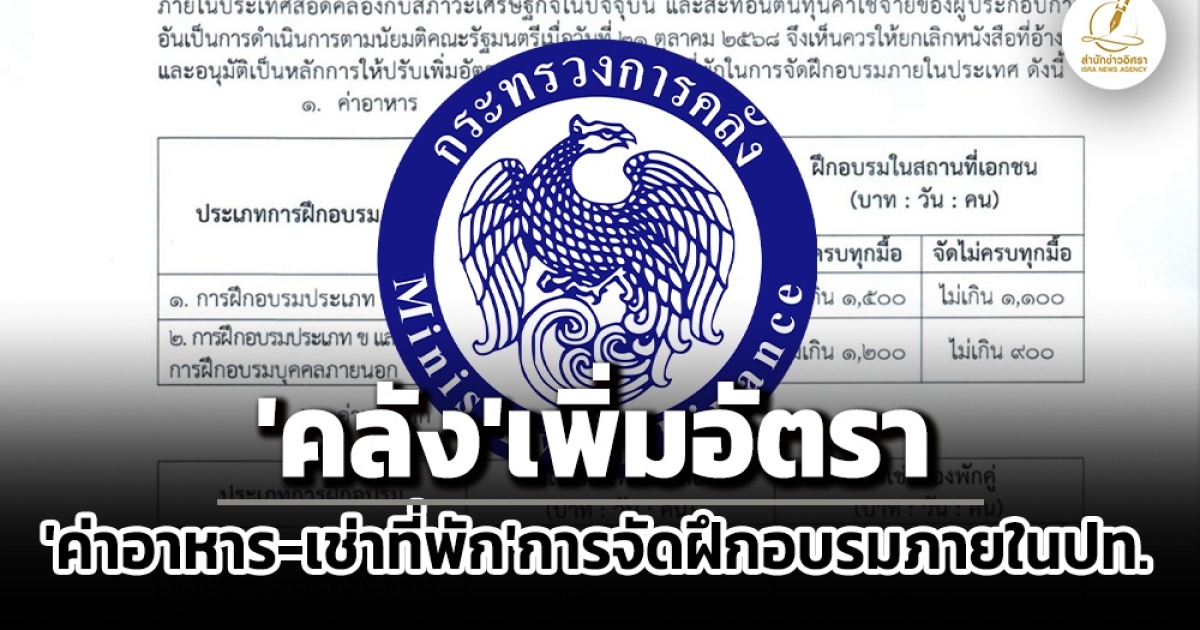 สำนักข่าวอิศรา (www.isranews.org) รายงานว่า เมื่อวันที่ 31 ต.ค. กระทรวงการคลัง โดย นายปิ่นสาย สุรัสวดี รองปลัดกระทรวงการคลัง หัวหน้ากลุ่มภารกิจด้านรายจ่ายและหนี้สิน ได้ลงนามในหนังสือกระทรวงการคลัง ด่วนที่สุด ที่ กค 0408.4/ ว246 เรื่อง การปรับปรุงอัตราค่าอาหารและค่าเช่าที่พักในการจัดฝึกอบรมภายในประเทศ ลงวันที่ 31 ต.ค.2568 แจ้งไปยังปลัดกระทรวง อธิบดี เลขาธิการ ผู้อำนวยการ อธิการบดี ผู้บัญชาการ ผู้ว่าราชการจังหวัด