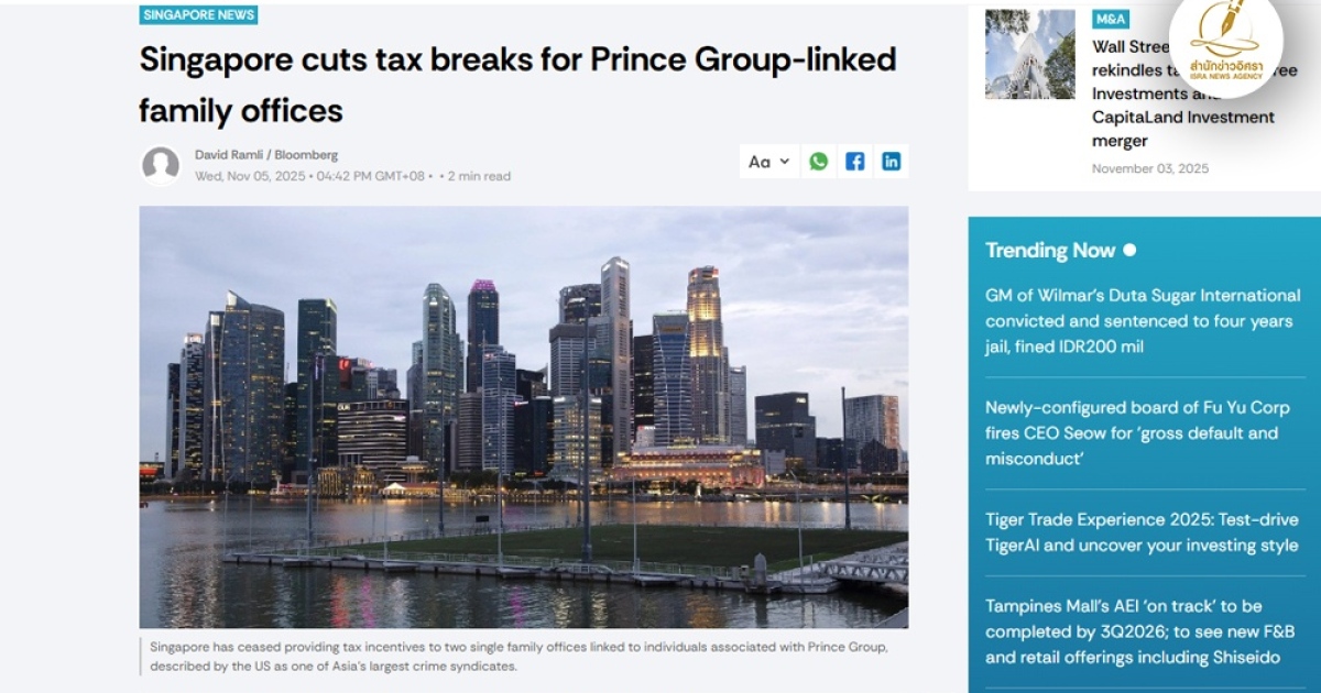 สิงคโปร์ยุติมาตรการช่วยเหลือภาษี 2 บ. เหตุเอี่ยวปรินซ์กรุ๊ป หลังผ่านกฎหมายเฆี่ยนสแกมเมอร์ ชี้ปัจจุบันมี บ.จัดการความมั่งคั่งครอบครัวกว่า 1,300 แห่งไม่ผ่านเกณฑ์ขอยกเว้นภาษี