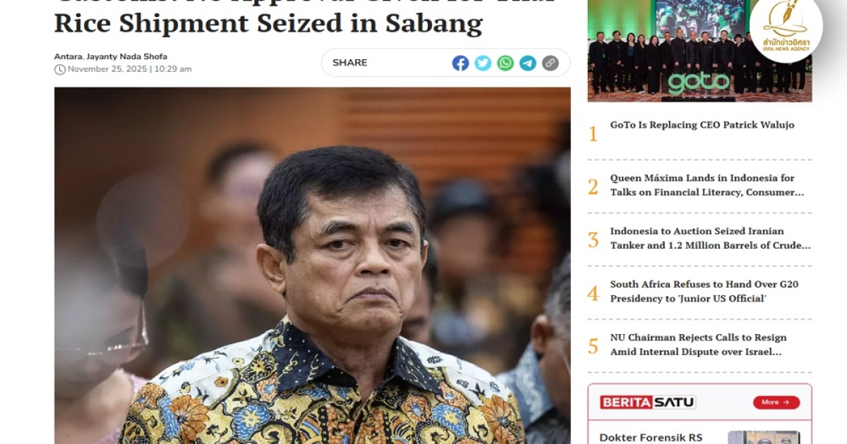 อินโดฯอายัดข้าวลักลอบนำเข้าจากไทย 250 ตัน ผ่านทางเขตการค้าเสรีซาบัง ก่อนถูกนำเก็บที่โกดัง บ.มุลตาซัม ซาบัง ด้านอธิบดีศุลกากรฯ อินโดฯ ออกมาปฏิเสธข่าว ยืนยันไม่เคยอนุมัตินำเข้า