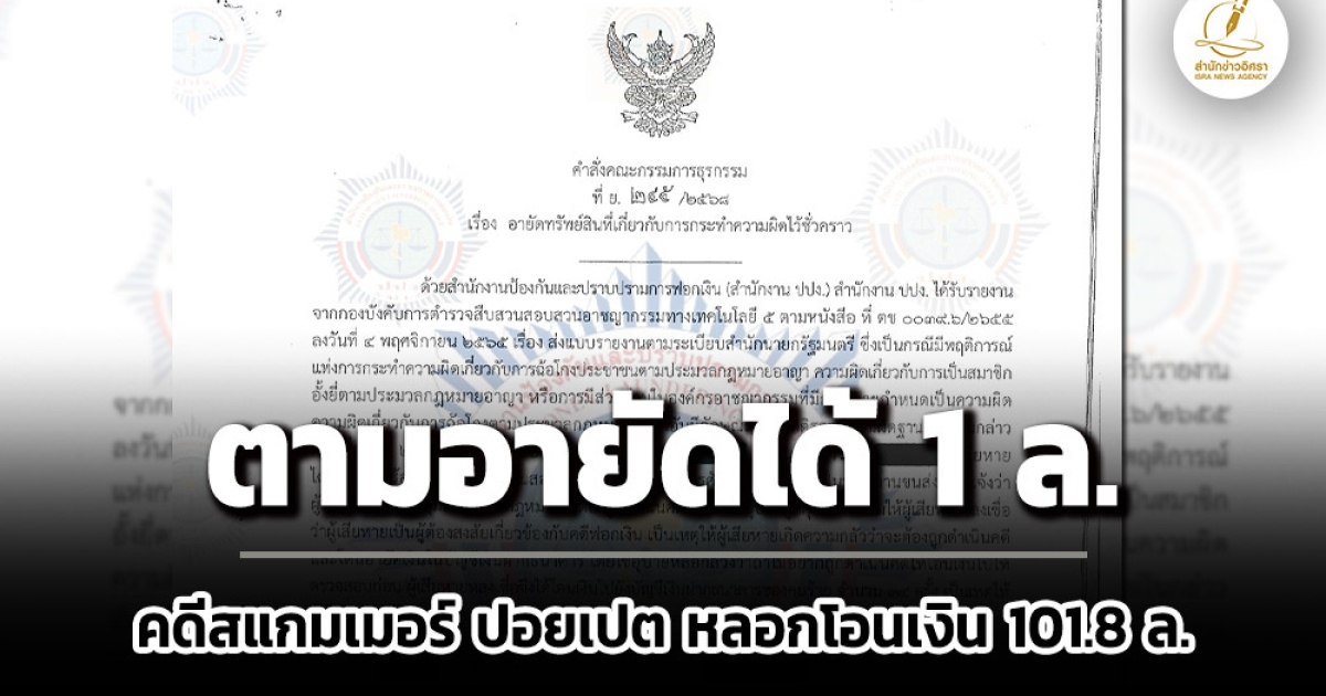 ปปง.ตามอายัดได้ 1 ล.คดี 2 ผู้เสียหาย จ.ชุมพร ถูกสแกมเมอร์อ้างส่งพัสดุผิด กม.ติดค้าง หว่านล้อม หลอกโอนเงิน 34 ครั้ง 101.8 ล. โยงอาคารประตูดำ ปอยเปต กัมพูชา