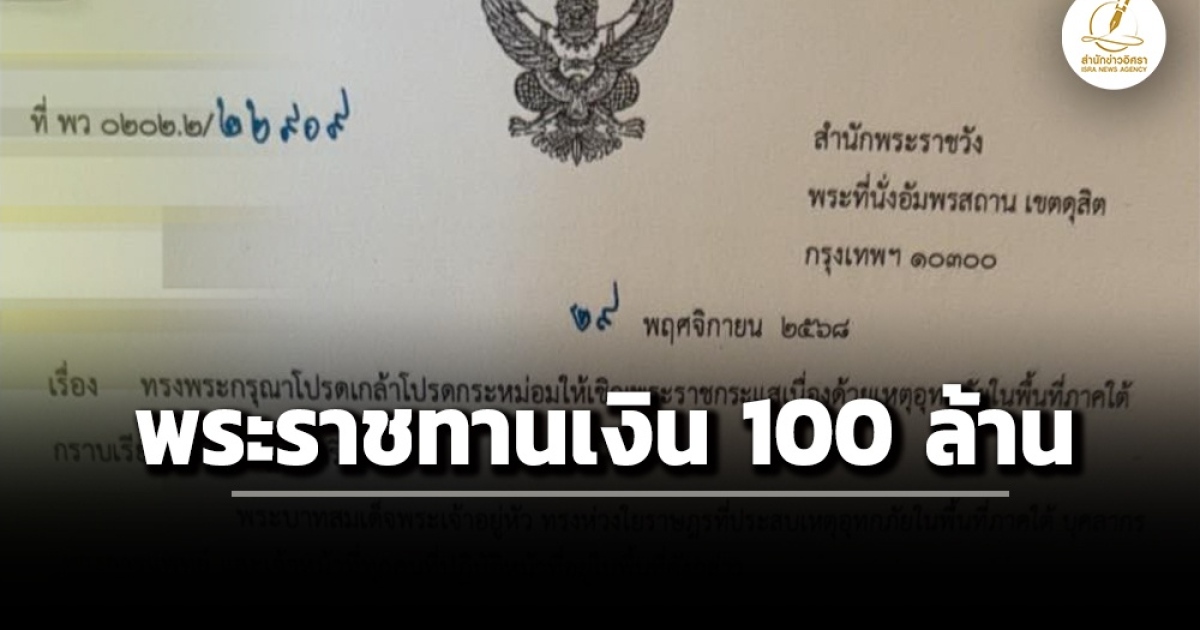 พร้อมรูปภาพเอกสารสำนักพระราชวัง เรื่อง ทรงพระกรุณาโปรดเกล้าโปรดกระหม่อมให้เชิญพระราชกระแสเนื่องด้วยเหตุอุทกภัยในพื้นที่ภาคใต้ ทรงพระกรุณาโปรดเกล้าโปรดกระหม่อมรับศพผู้เสียชีวิตจากเหตุอุทกภัยในพื้นที่ภาคใต้ทุกรายไว้ในพระบรมราชานุเคราะห์ และทรงพระกรุณาโปรดเกล้าโปรดกระหม่อมพระราชทานเงิน จำนวน 100 ล้านบาท แก่โรงพยาบาลหาดใหญ่ อำเภอหาดใหญ่ จังหวัดสงขลา เพื่อฟื้นฟูและซื้อเครื่องมือทางการแพทย์ ทดแทนที่เสียหายและได้รับผลกระทบจากเหตุอุทกภัย โดยมีลายมือชื่อท้ายเอกสารลงนามโดยพล.อ.อ.สถิตย์พงษ์ สุขวิมล ราชเลขานุการในพระองค์พระบาทสมเด็จพระเจ้าอยู่หัว มีรายละเอียดดังนี้