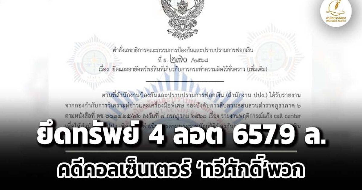 สำนักข่าวอิศรา www.isranews.org รายงาน สำนักงานคณะกรรมการป้องกันและปราบปรามการฟอกเงิน (สำนักงาน ปปง.) มีคำสั่งคณะกรรมการธุรกรรมที่ ที่ ย. 270 /2568 วันที่ 30 ต.ค.2568 เรื่อง ยึดและอายัดทรัพย์สินที่เกี่ยวกับการกระทำความผิดไว้ชั่วคราว (เพิ่มเติม) ราย กลุ่มบุคคลที่ใช้โทรศัพท์หลอกลวงประชาชน รายนายทวีศักดิ์ กับพวก ซึ่งเป็นกรณีมีพฤติการณ์แห่งการกระทำความผิดเกี่ยวกับการฉ้อโกงประชาชนตามประมวลกฎหมายอาญา และความผิดเกี่ยวกับการฉ้อโกงตามประมวลกฎหมายอาญาอันมีลักษณะเป็นปกติธุระ โดยมีพฤติการณ์ แก๊ง call center แอบอ้างตนเป็นตำรวจภูธร ภาค 6 หรือแอบอ้างว่าเป็นเจ้าหน้าที่ไปรษณีย์หลอกลวงให้ประชาชนโอนเงินไปยังบัญชีเงินฝากธนาคารต่าง ๆ ซึ่งกลุ่มคนร้ายเปิดไว้เพื่อใช้รองรับเงินที่ได้จากการหลอกลวงประชาชน ทรัพย์สินที่ยึดและอายัด จำนวน 11 รายการ มูลค่า 350,544,128.17 บาท ประกอบด้วย ห้องชุด 3 ห้องในกรุงเทพฯในชื่อบุคคลต่างชาติ ที่ดินตามโฉนดในจ.ตราด 1 แปลง เนื้อที่ 15 ไร่ 1 งาน ในชื่อบุคคล และ เงินในบัญชีเงินฝาก 7 รายการ ในชื่อบุคคล