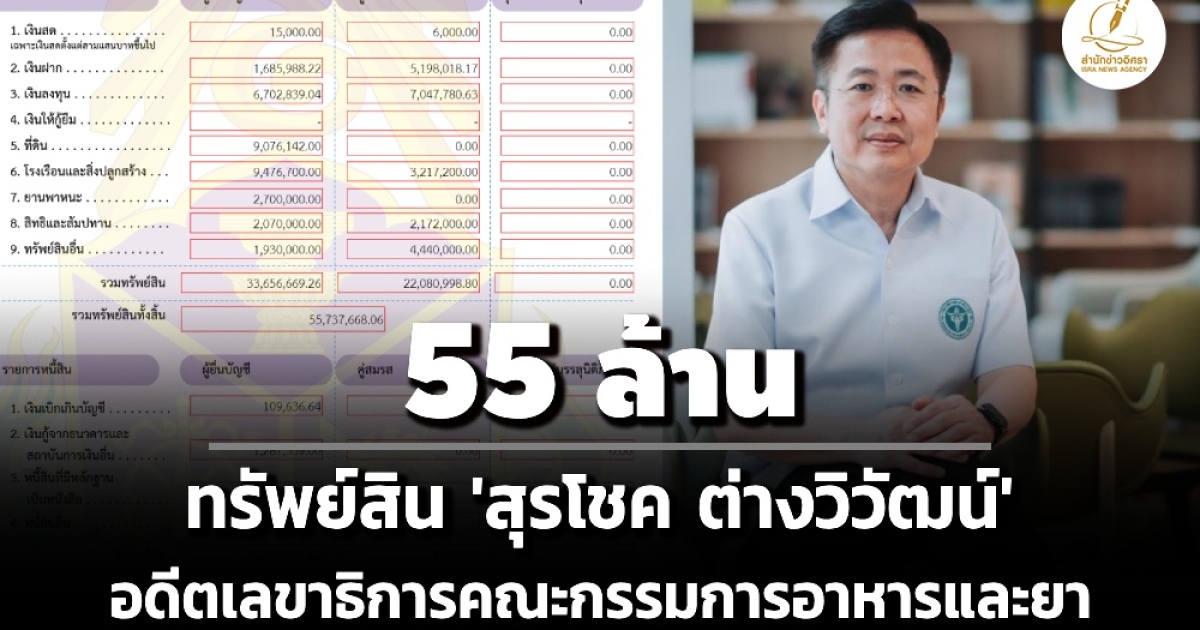 ป.ป.ช. เปิดทรัพย์สินผู้ดำรงตำแหน่งระดับสูง 'สุรโชค ต่างวิวัฒน์' อดีตเลขาธิการคณะกรรมการอาหารและยา ทรัพย์สิน 55 ล. รายได้ 2.4 ล./ปี