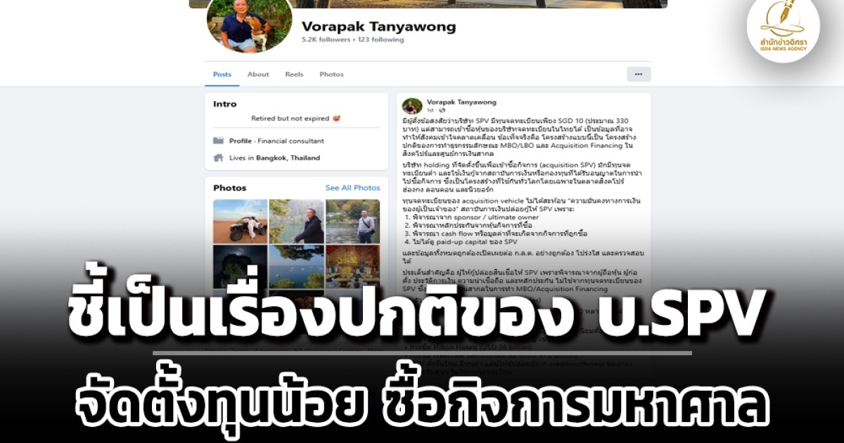 'วรภัค' โต้ข้อกล่าวหา ปชป.ปม บ.ทุน 330 บาท ซื้อหุ้นฟินันเซีย 693 ล้าน ชี้เป็นเรื่องปกติของ บ.holding SPV จัดตั้งขึ้นเพื่อเข้าซื้อกิจการ ที่จดทะเบียนมาด้วยทุนต่ำอยู่แล้ว ยกตังอย่าง บ.ดังระดับโลกอย่างกูเกิลซื้อโมโตโรล่า-เฟซบุ๊กซื้อวอตส์แอปก็ตั้ง SPV กันทั้งนั้น