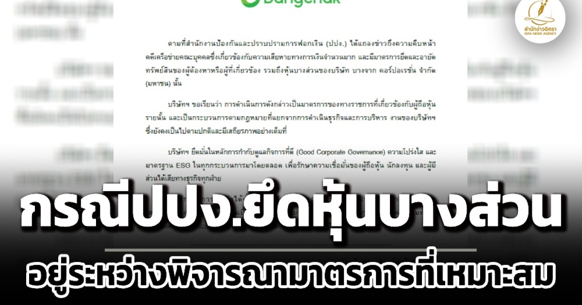 สำนักข่าวอิศรา (www.isranews.org) รายงานว่า เมื่อวันที่ 3 ธ.ค. 2568 ฝ่ายบริหารภาพลักษณ์และสื่อสารองค์กร บริษัท บางจาก คอร์ปอเรชั่น จำกัด (มหาชน) เผยแพร่ข่าวประชาสัมพันธ์ ตามที่สำนักงานป้องกันและปราบปรามการฟอกเงิน (ปปง.) ได้แถลงข่าวถึงความคืบหน้า คดีเครือข่ายคณะบุคคลซึ่งเกี่ยวข้องกับความเสียหายทางการเงินจำนวนมาก และมีมาตรการยึดและอายัดทรัพย์สินของผู้ต้องหาหรือผู้ที่เกี่ยวข้อง รวมถึงหุ้นบางส่วนของบริษัท บางจาก คอร์ปอเรชั่น จำกัด (มหาชน) นั้น