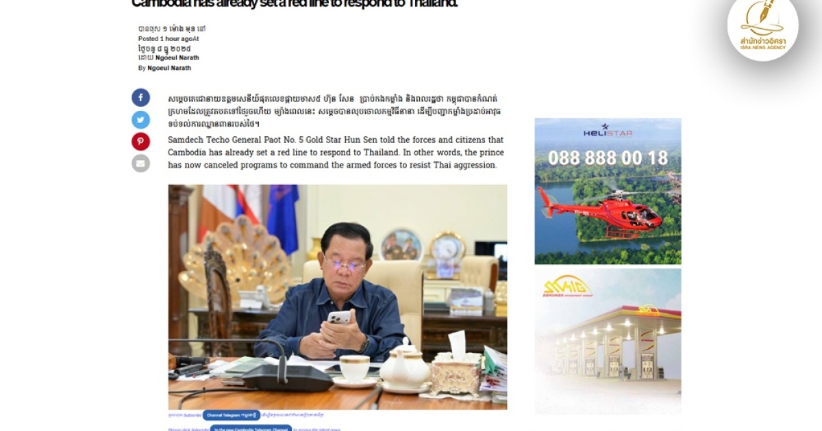 สำนักข่าวอิศรา (www.isranews.org) รายงานข่าวสถานการณ์ความขัดแย้งไทยและกัมพูชา โดยอ้างอิงข่าวจากทางฝั่งกัมพูชา โดยสำนักข่าว Kampuchea Thmey Daily ของกัมพูชารายงานข่าวว่าเมื่อเช้าวันที่ 8 ธ.ค. นายฮุน เซน ประธานวุฒิสภากัมพูชา อดีตนายกรัฐมนตรีกัมพูชา ได้โพสต์ข้อความผ่านเฟซบุ๊ก โดยระบุให้ "กองกำลังแนวหน้าทั้งหมดต้องอดทน" เนื่องจากผู้รุกรานได้ใช้อาวุธทุกชนิดยิงใส่กัมพูชามาตั้งแต่เมื่อวาน คืนที่แล้ว และเช้านี้
