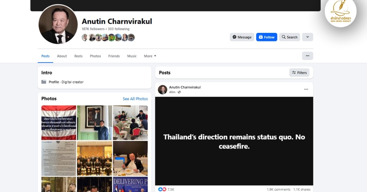 ทางด้านของนายอนุทิน ชาญวีรกุล นายกรัฐมนตรีได้โพสต์เฟซบุ๊กส่วนตัวเป็นภาษาอังกฤษระบุว่า Thailand’s direction remains status quo. No ceasefire. (ทิศทางประเทศไทยยังเหมือนเดิม ไม่มีการหยุดยิง)"