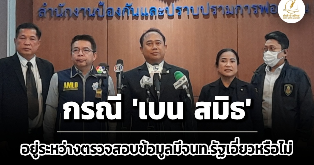 สำนักข่าวอิศรา (www.isranews.org) รายงานว่า เมื่อวันที่ 11 ธ.ค. 2568 เวลา14.30 น. ที่สำนักงานป้องกันและปราบปรามการฟอกเงิน (ปปง.) มีการประชุมร่วมกันระหว่างสำนักงานคณะกรรมการการป้องกันและปราบการทุจริตแห่งชาติ (ป.ป.ช.) กับ ปปง. กรณีนายสุรพงษ์ อินทรถาวร รองเลขาธิการฯ รักษาราชการแทนเลขาธิการคณะกรรมการ ป.ป.ช. มอบหมายให้นายพัฒนพงศ์ จันทร์เพ็ชรพูล ผู้ช่วยเลขาธิการคณะกรรมการ ป.ป.ช. ประสานสำนักงาน ปปง. เพื่อขอข้อมูลการฟอกเงินกรณีของนายเบน สมิธ และพวก ว่ามีเจ้าหน้าที่รัฐเกี่ยวข้องหรือไม่ รวมถึงหารือแนวทางบูรณาการข้อมูลร่วมกันในการตรวจสอบเจ้าพนักงานของรัฐซึ่งเป็นบุคคลที่มีสถานภาพทางการเมือง ตามประกาศสำนักงานป้องกันและปราบปรามการฟอกเงิน เรื่อง บุคคลที่มีสถานภาพทางการเมือง พ.ศ.2568 และหารือแนวทางการตรวจสอบข้อมูลข่าวสารที่เกี่ยวข้องกับเจ้าพนักงานของรัฐที่ประชาชนหรือสื่อมวลชนให้ความสนใจ
