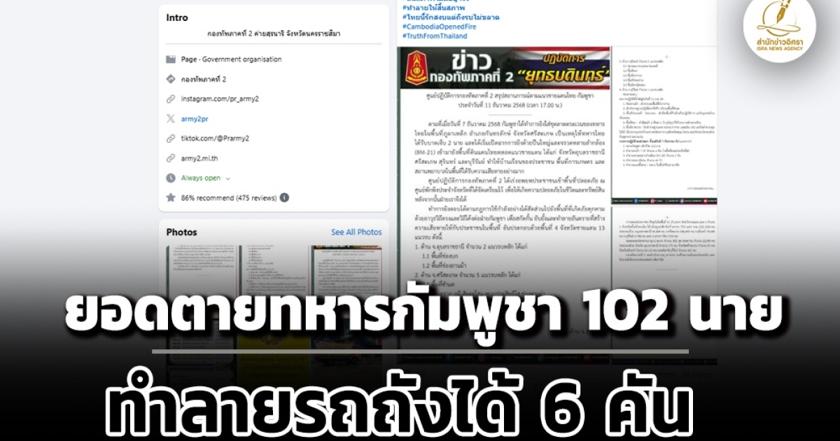 สำนักข่าวอิศรา (www.isranews.org) รายงานข่าวความขัดแย้งไทยและกัมพูชา อ้างอิงข่าวจากเฟซบุ๊กกองทัพภาคที่ 2 (ทภ.2) ระบุว่าตามที่เมื่อวันที่ 7 ธันวาคม 2568 กัมพูชาได้ทำการยิงใส่ชุดลาดตระเวนของทหารไทยในพื้นที่ภูผาเหล็ก อำเภอกันทรลักษ์ จังหวัดศรีสะเกษ เป็นเหตุให้ทหารไทยได้รับบาดเจ็บ 2 นาย และได้เริ่มเปิดฉากการยิงด้วยปืนใหญ่และจรวดหลายลำกล้อง (BM-21) เข้ามายังพื้นที่ดินแดนไทยตลอดแนวชายแดน ได้แก่ จังหวัดอุบลราชธานี ศรีสะเกษ สุรินทร์ และบุรีรัมย์ ทำให้บ้านเรือนของประชาชน พื้นที่การเกษตร และสถานพยาบาลในพื้นที่ได้รับความเสียหายอย่างมาก