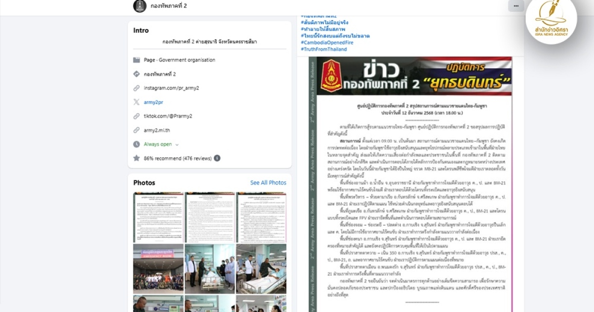 สำนักข่าวอิศรา (www.isranews.org) รายงานว่าเมื่อวันที่ 12 ธ.ค. กองทัพภาคที่ 2 ได้สรุปสถานการณ์สู้รบไทยกัมพูชา ประจำวัน เนื้อหาระบุว่าศูนย์ปฏิบัติการกองทัพภาคที่ 2 สรุปสถานการณ์ตามแนวชายแดนถึงเวลา 18.00 น. ดังนี้