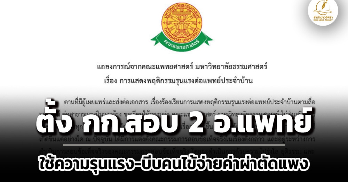 มธ.ตั้งคณะกรรมการสอบข้อเท็จจริงกรณี 2 อาจารย์หมอใช้ความรุนแรง ทำร้ายร่างกายแพทย์ประจำบ้าน-บีบคนไข้จ่ายค่าผ่าตัดแพง