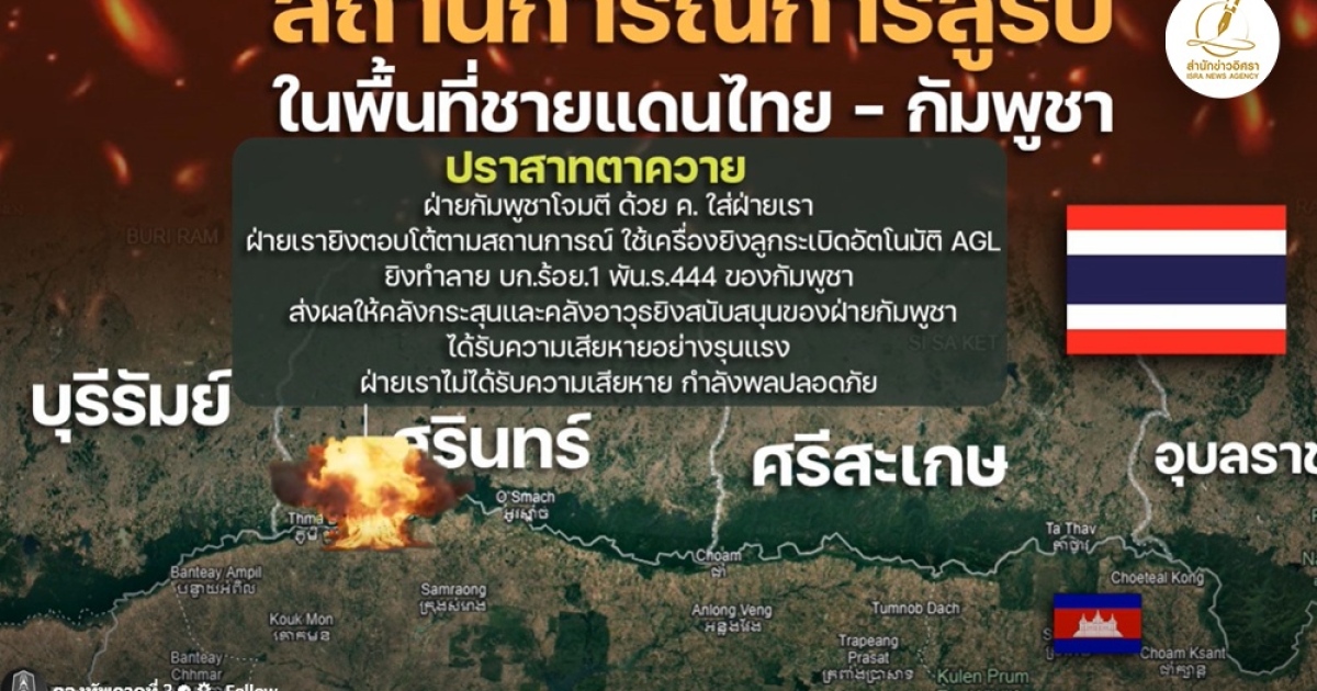 ทภ.2 สรุปสถานการณ์สู้รบไทย-กัมพูชา เผยอีกฝ่ายยังยิง BM-21 หลายพื้นที่ควบคู่ใช้โดรน-ไทยตรึงกำลัง-ตอบโต้ตามเหตุการณ์-มีคำสั่งห้ามส่งออกน้ำมันเชื้อเพลิงทุกชนิดที่จุดผ่านแดนช่องเม็ก
