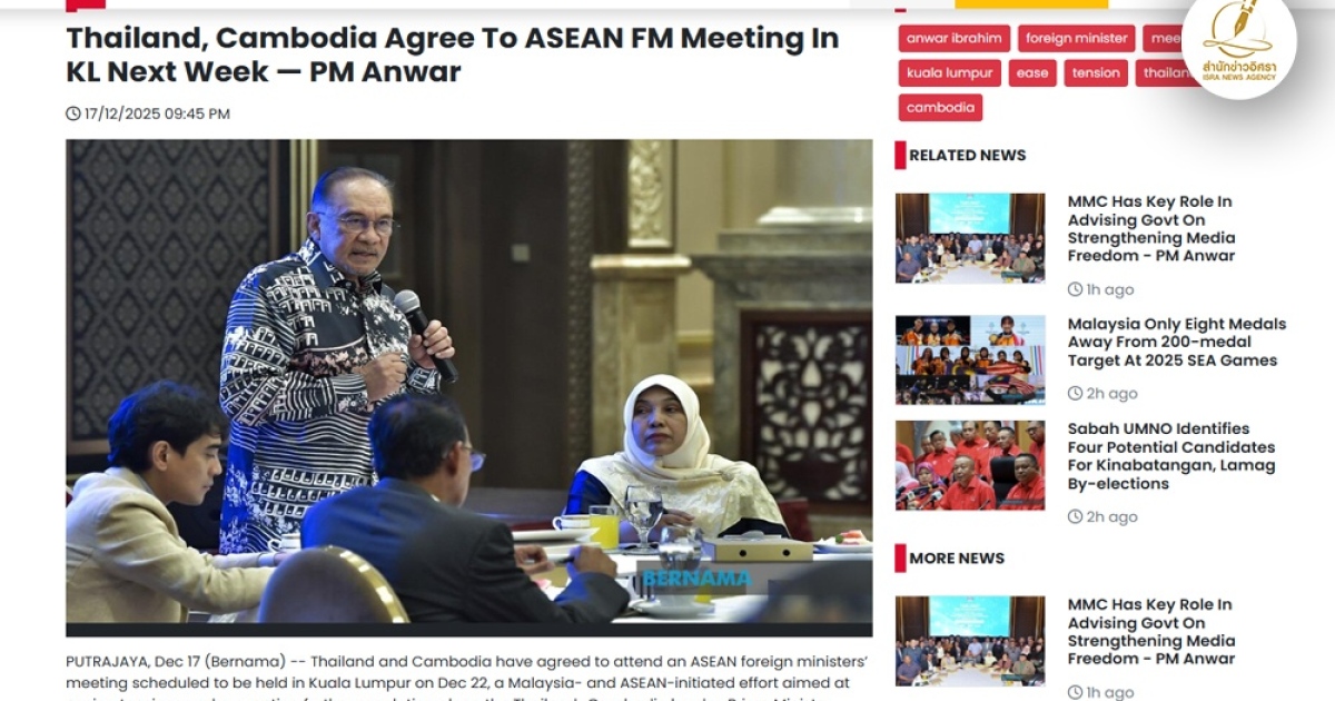สำนักข่าวอิศรา (www.isranews.org) รายงานข่าวสถานการณ์การสู้รบไทยและกัมพูชา จากทางฝั่งมาเลเซียว่านายดาโต๊ะ สรี อันวาร์ อิบราฮิม นายกรัฐมนตรีกัมพูชาและประธานอาเซียนได้ออกมากล่าวในช่วงเย็นวันที่ 17 ธ.ค.ว่าประเทศไทยและกัมพูชาได้ตกลงที่จะเข้าร่วมการประชุมรัฐมนตรีต่างประเทศอาเซียนซึ่งกำหนดจัดขึ้นที่กรุงกัวลาลัมเปอร์ในวันที่ 22 ธ.ค. ซึ่งการพบปะครั้งนี้เป็นความพยายามของมาเลเซียและอาเซียนที่ริเริ่มขึ้นโดยมีเป้าหมายเพื่อคลี่คลายความตึงเครียดและป้องกันการบานปลายของสถานการณ์ตามแนวชายแดนไทย-กัมพูชา
