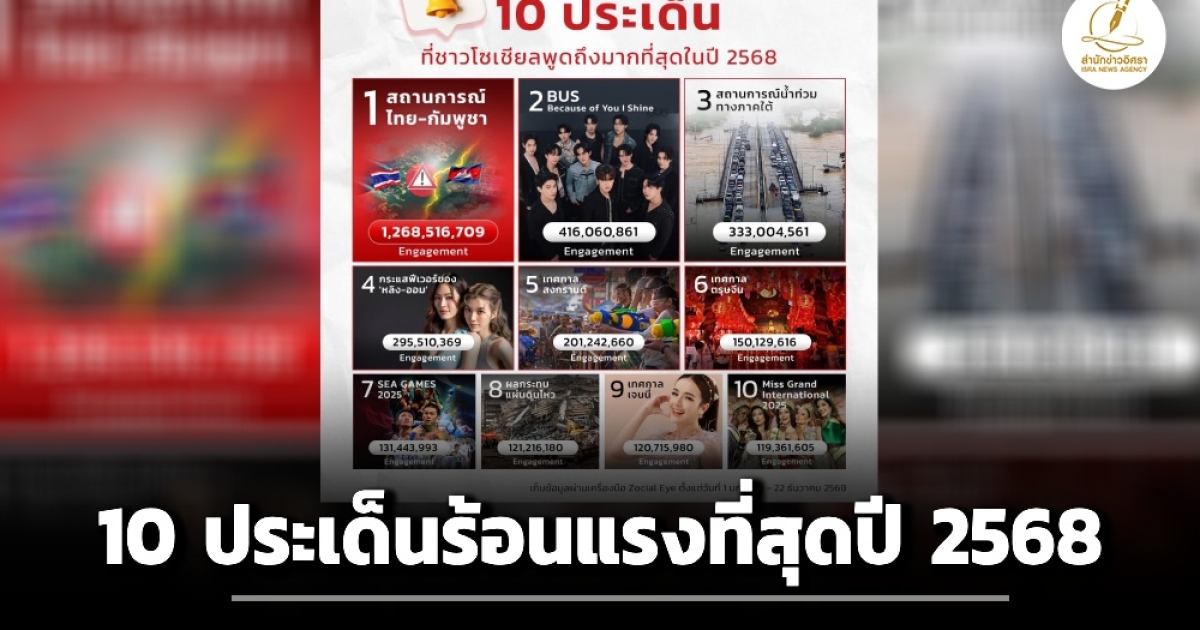 สำนักข่าวอิศรา (www.isranews.org) รายงานว่า เมื่อวันที่ 24 ธ.ค. 2568 บริษัท ไวซ์ไซท์ (ประเทศไทย) จำกัด เผยแพร่ข่าวประชาสัมพันธ์จัดอันดับประเด็นที่ชาวโซเชียลพูดถึงมากที่สุดในปี 2568