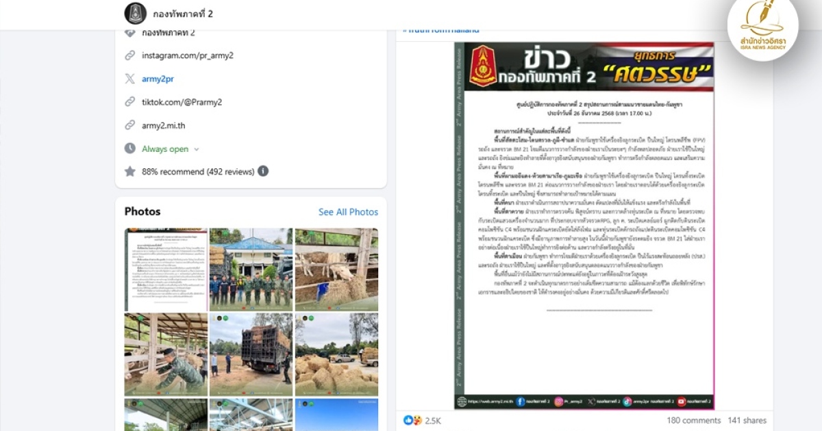 สำนักข่าวอิศรา (www.isranews.org) รายงานข่าวสภานการณ์ชายแดนไทยและกัมพูชา อ้างอิงข้อมูลจากเฟซบุ๊กกองทัพภาคที่ 2 ก็ได้มีการรายงานสถานการณ์มีรายละเอียดดังนี้