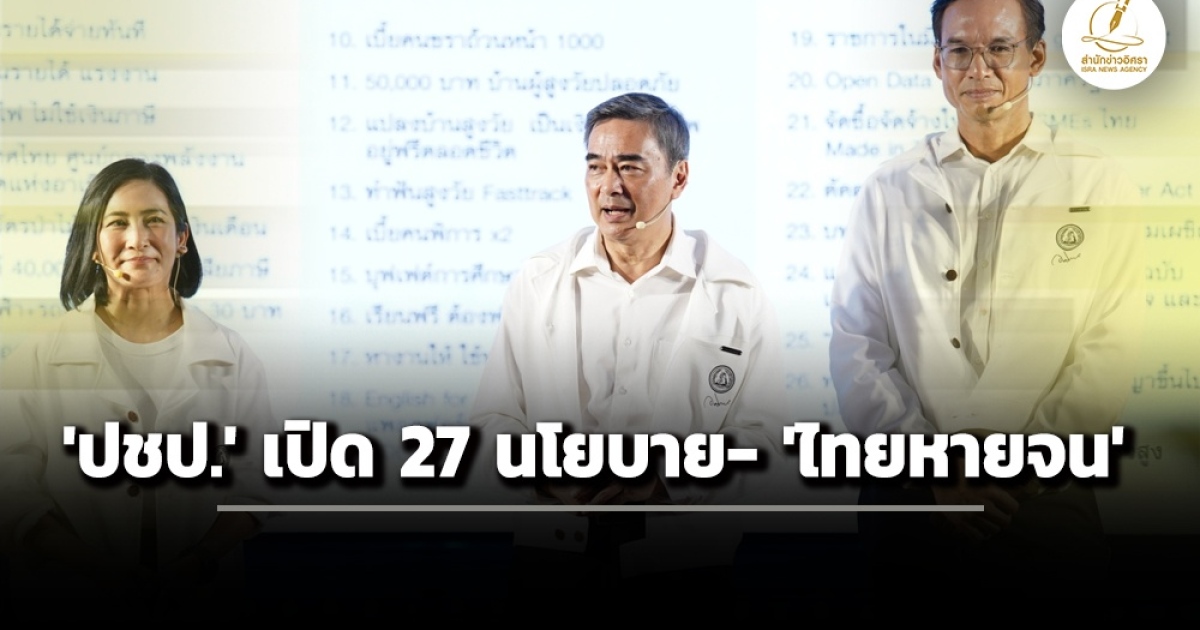 'อภิสิทธิ์-กรณ์-การดี' เปิดตัวชุดนโยบายหาเสียงเลือกตั้ง 4 เสาหลัก 27 นโยบาย 'ไทยหายจน' ประกันรายได้เกษตรกร-แรงงาน เงินได้ 40,000 บาทแรก ไม่เสียภาษี รถไฟฟ้า+รถเมล์ สูงสุด 30 บาท เงินอุดหนุนมารดาและเด็กเดือนละ 5,000 บาท 1 ปี เพิ่มเบี้ยคนชราถ้วนหน้าคนละ 1,000 บาทต่อเดือน เพิ่มรายได้ขั้นต่ำผู้พิการ 1,600 บาทต่อเดือน ผู้พิการอายุน้อยกว่า 18 ปี 2,000 บาทต่อเดือน