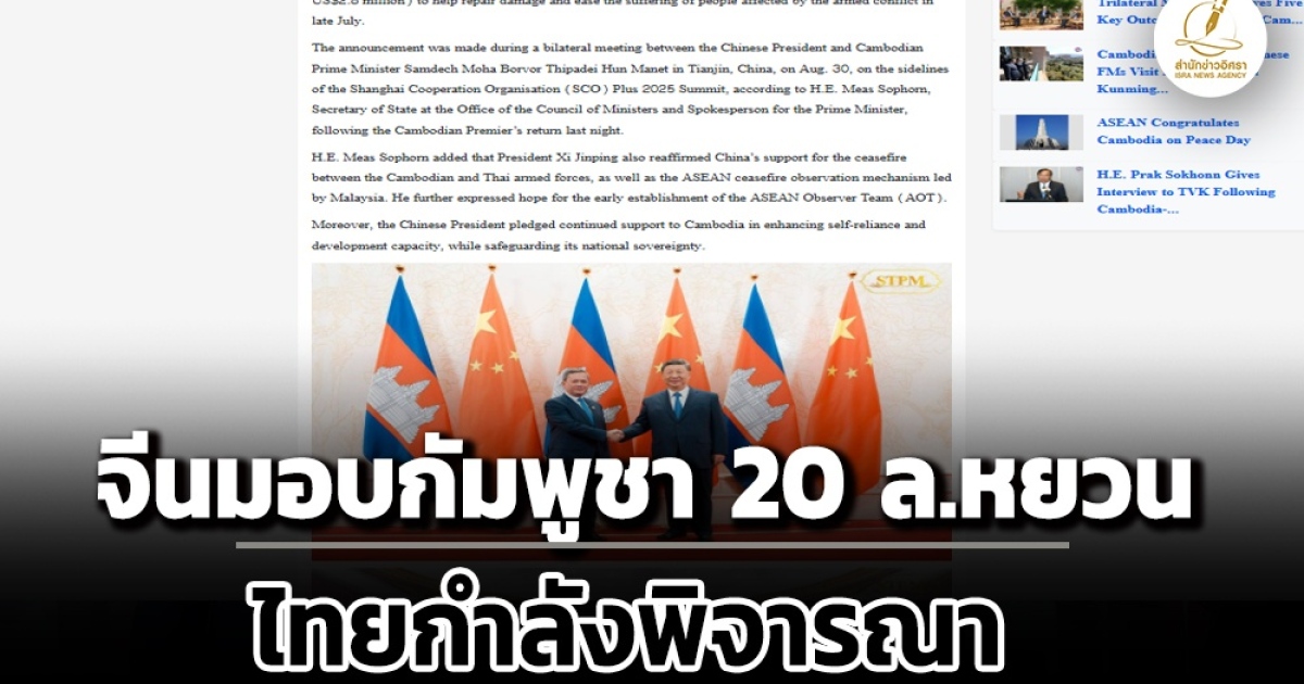 จีนมอบเงิน 20 ล้านหยวน แก่กัมพูชา ช่วยเหลือพลเรือนพลัดถิ่น ความขัดแย้งชายแดนกัมพูชา-ไทย ส่งของล็อตแรก มอบเต็นท์ ผ้าห่ม ถึงกัมพูชาแล้ว- ทูตจีนประจำกัมพูชายืนยันส่งเสริมบทบาทสร้างสรรค์ระหว่าง 2 ชาติ ด้าน 'อนุทิน' ยันจีนเสนอ 20 ล้านหยวนให้ไทยเหมือนกัน กำลังอยู่ระหว่างการรอพิจารณาร่วมกับ รมว.กต.ว่าจะรับข้อเสนอหรือไม่