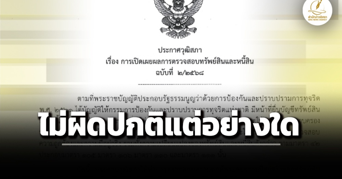 สำนักข่าวอิศรา (www.isranews.org) รายงานว่า เมื่อเร็วๆ นี้ เว็บไซต์สำนักงานเลขาธิการวุฒิสภา ได้เผยแพร่ประกาศวุฒิสภา เรื่อง การเปิดเผยผลการตรวจสอบทรัพย์สินและหนี้สิน ฉบับที่ 2/2568 รายนายเอกวิทย์ วัชชวัลคุ กรณีเข้ารับตำแหน่งกรรมการ ป.ป.ช. เมื่อวันที่ 3 ม.ค.67 ว่า ไม่ผิดปกติแต่อย่างใด