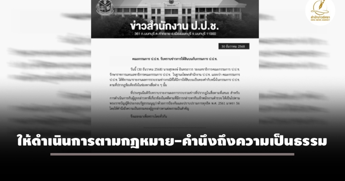 สำนักข่าวอิศรา (www.isranews.org) รายงานว่า เมื่อวันที่ 30 ธ.ค. 2568 นายสุรพงษ์ อินทรถาวร รองเลขาธิการคณะกรรมการ ป.ป.ช. รักษาราชการแทนเลขาธิการคณะกรรมการ ป.ป.ช. ในฐานะโฆษกสำนักงาน ป.ป.ช. แถลงว่าคณะกรรมการ ป.ป.ช. ได้พิจารณารายงานผลการรวบรวมข่าวกรณีที่ได้มีการให้สินบนเป็นทองคำกับหนึ่งในกรรมการ ป.ป.ช. ตามที่ปรากฏข้อเท็จจริงในช่องทางสื่อต่าง ๆ นั้น
