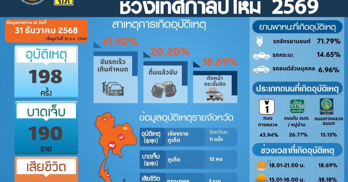 สำนักข่าวอิศรา (www.isranews.org) รายงานว่า เมื่อวันที่ 31 ธ.ค.2568 ศูนย์อำนวยการป้องกันและลดอุบัติเหตุทางถนนช่วงเทศกาล ปีใหม่ พ.ศ. 2569 รายงานสถิติอุบัติเหตุทางถนนประจำวันที่ 30 ธันวาคม 2568 วันแรกของการควบคุมเข้มข้น เกิดอุบัติเหตุ 198 ครั้ง ผู้บาดเจ็บ 190 คน ผู้เสียชีวิต 29 ราย