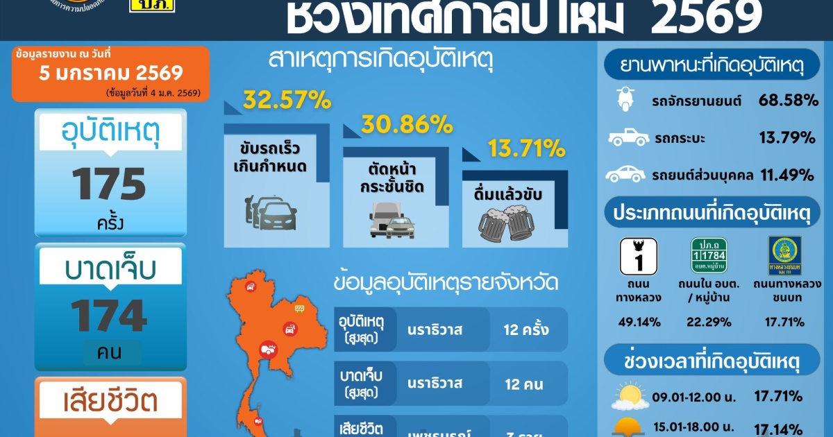 นายสหรัฐ วงศ์สกุลวิวัฒน์ รองอธิบดีกรมป้องกันและบรรเทาสาธารณภัย ในฐานะผู้ช่วยเลขานุการศูนย์อำนวยการความปลอดภัยทางถนนช่วงเทศกาลปีใหม่ 2569 และประธานแถลงข่าวสรุปผลการดำเนินงานของศูนย์อำนวยการป้องกันและลดอุบัติเหตุทางช่วงเทศกาลปีใหม่ พ.ศ. 2569 เปิดเผยว่า ศูนย์อำนวยการป้องกันและลดอุบัติเหตุทางถนนช่วงเทศกาลปีใหม่ พ.ศ. 2569 โดยกรมป้องกันและบรรเทาสาธารณภัยและความร่วมมือของภาคีเครือข่ายได้รวบรวมสถิติอุบัติเหตุทางถนน ประจำวันที่ 5 มกราคม 2569 ซึ่งเป็นวันที่หกของการรณรงค์ “ขับขี่ปลอดภัย ลดความเร็ว ลดอุบัติเหตุ” เกิดอุบัติเหตุ 175 ครั้ง ผู้บาดเจ็บ 174 คน ผู้เสียชีวิต 27 ราย สาเหตุที่ทำให้เกิดอุบัติเหตุสูงสุด ได้แก่ ขับรถเร็วเกินกำหนด ร้อยละ 32.57 ตัดหน้ากระชั้นชิด ร้อยละ 30.86 ยานพาหนะที่เกิดอุบัติเหตุสูงสุด ได้แก่ รถจักรยานยนต์ ร้อยละ 68.58 ส่วนใหญ่เกิดบนเส้นทางตรง ร้อยละ 84.57 ถนนกรมทางหลวง ร้อยละ 49.14 ถนนใน อบต./หมู่บ้าน ร้อยละ 22.29 ช่วงเวลาที่เกิดอุบัติเหตุสูงสุด ได้แก่ ช่วงเวลา 09.01 - 12.00 น. ร้อยละ 17.71 ผู้บาดเจ็บและเสียชีวิตสูงสุด อยู่ในช่วงอายุ 20 - 29 ปี ร้อยละ 18.91 โดยจังหวัดที่เกิดอุบัติเหตุสูงสุด ได้แก่ นราธิวาส (12 ครั้ง) จังหวัดที่มีผู้บาดเจ็บสูงสุด ได้แก่ นราธิวาส (12 คน) จังหวัดที่มีผู้เสียชีวิตสูงสุด ได้แก่ เพชรบูรณ์ (3 ราย)