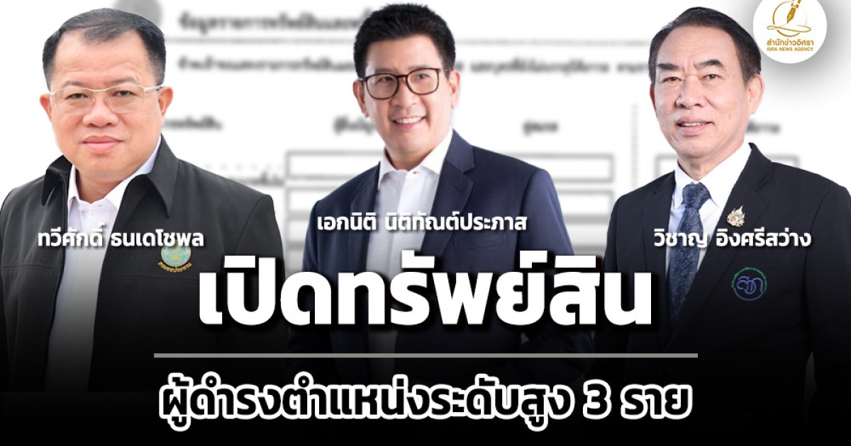 สำนักข่าวอิศรา (www.isranews.org) รายงานว่า เมื่อวันที่ 7 มกราคม 2569 สำนักงานคณะกรรมการการป้องกันและปราบการทุจริตแห่งชาติ (ป.ป.ช.) เปิดเผยบัญชีแสดงรายการทรัพย์สินและหนี้สิน ผู้ดำรงตำแหน่งระดับสูง 3 ราย คือ นายเอกนิติ นิติทัณต์ประภาส อธิบดี / กรรมการ บริษัท ธนารักษ์พัฒนาสินทรัพย์ จำกัด และ กรรมการ บริษัท ปตท.สำรวจและผลิตปิโตรเลียม จำกัด (มหาชน) กรณีพ้นจากการเป็นเจ้าหน้าที่รัฐ ผู้อำนวยการสำนักงานพัฒนาการวิจัยการเกษตร 2 ราย คือ นายวิชาญ อิงศรีสว่าง กรณีพ้นจากตำแหน่ง และ นายทวีศักดิ์ ธนเดโชพล กรณีเข้ารับตำแหน่ง