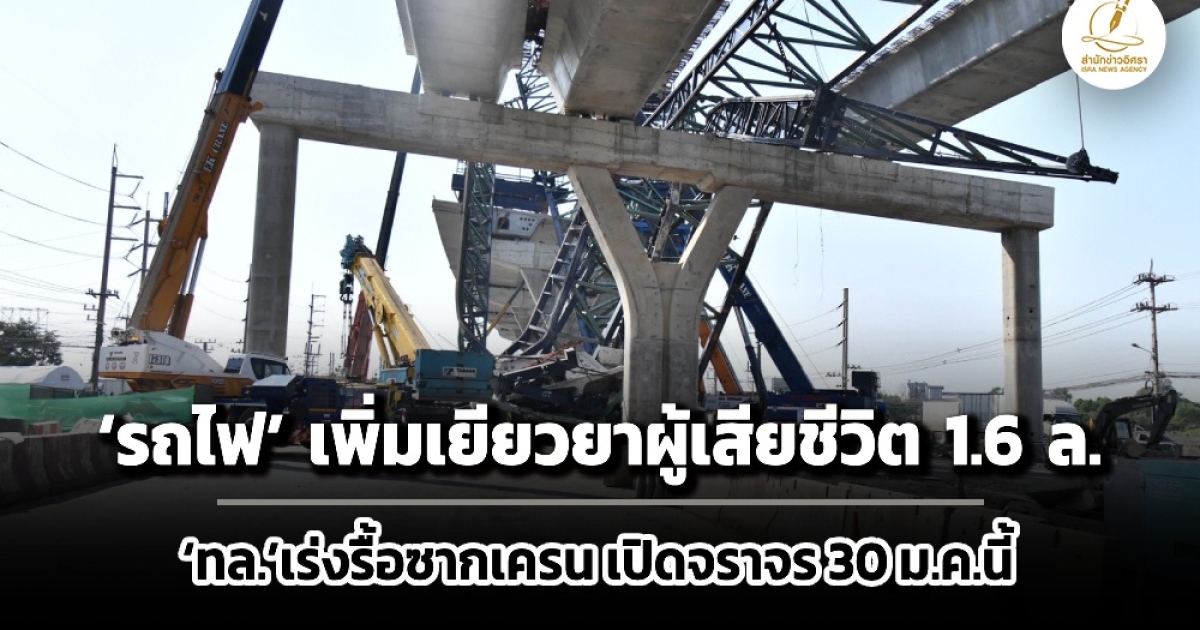 อัพเดท 2 เหตุการณ์ถล่ม ‘รถไฟ’ เพิ่มเงินเยียวยาผู้เสียชีวิตสูงสุด 1.6 ล้านบาท ด้าน ‘อิตาเลียนไทย’ ออกเงินค่าทำศพ 80,000-150,000 บาทแล้วแต่กรณี ด้านกรมทางหลวงกางแผนรื้อย้ายซากเครนที่หักลงมา คาดแล้วเสร็จและเปิดการสัญจรได้ 30 ม.ค.นี้