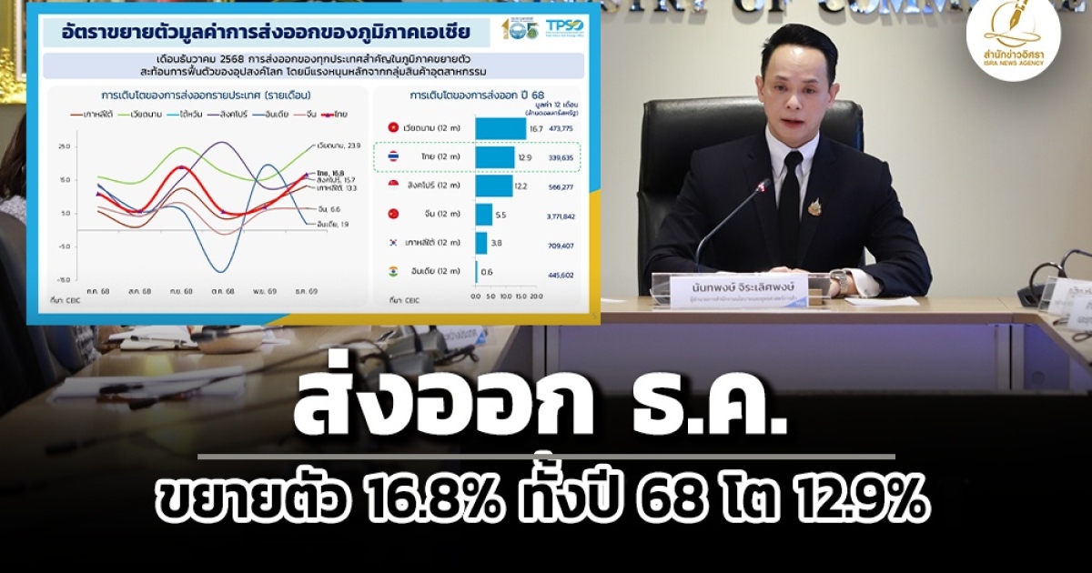 ‘พาณิชย์’ เผยส่งออก ธ.ค. ขยายตัว 16.8% ขณะที่ทั้งปี 68 โต 12.9% ขยายตัวสูงสุดในรอบ 4 ปี จับตา 2 ปัจจัยเสี่ยง ‘บาทแข็ง’-ความขัดแย้งภูมิศาสตร์’รุนแรง ส่อฉุดตัวเลขส่งออกปี 69 ติดลบ 3.1%