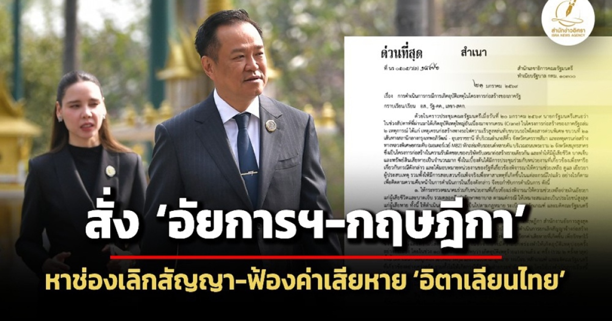 สำนักข่าวอิศรา (www.isranews.org) รายงานว่า วันที่ 24 มกราคม 2569 รายงานข่าวจากทำเนียบรัฐบาลเปิดเผยว่า ในการประชุมคณะรัฐมนตรี (ครม.) เมื่อวันที่ 20 มกราคม 2569 นายอนุทิน ชาญวีรกูล นายกรัฐมนตรีและรัฐมนตรีว่าการกระทรวงมหาดไทย เสนอความคิดเห็นถึงเหตุการณ์เครนถล่ม 2 เหตุการณ์คือ เครนก่อสร้างรถไฟความเร็วสูงไทย-จีน หล่นทับขบวนรถไฟโดยสารพิเศษขบวนที่ 21 เส้นทางสถานีกลางกรุงเทพอภิวัฒน์ - อุบลราชธานี และเครนก่อสร้างมอเตอร์เวย์สาย M82 หักถล่มทับรถยนต์หลายคัน บนถนนพระราม 2 เพื่อติดตามความคืบหน้าในการดำเนินการ จึงมีการกำชับการดำเนินการ ดังนี้