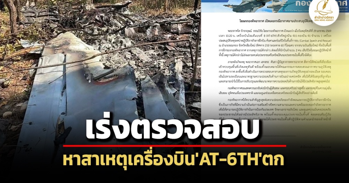 เมื่อวันที่ 29 ม.ค. พล.อ.ท.จักรกฤษณ์ ธรรมวิชัย โฆษกกองทัพอากาศ (ทอ.) เปิดเผยว่า เมื่อวันที่ 29 ม.ค.2569 เวลา 10.20 น. เครื่องบินโจมตีแบบที่ 8 (AT-6TH) สังกัดฝูงบิน 411 กองบิน 41 จำนวน 1 เครื่อง ประสบอุบัติเหตุระหว่างปฏิบัติภารกิจการฝึกบิน ค้นหาและช่วยชีวิตในพื้นที่การรบ (Combat Search and Rescue) ณ อำเภอจอมทอง จังหวัดเชียงใหม่ (ทิศทาง 210 ระยะทาง 60 กิโลเมตร จากสนามบินเชียงใหม่) ซึ่งเป็นพื้นที่การฝึกของกองทัพอากาศ
