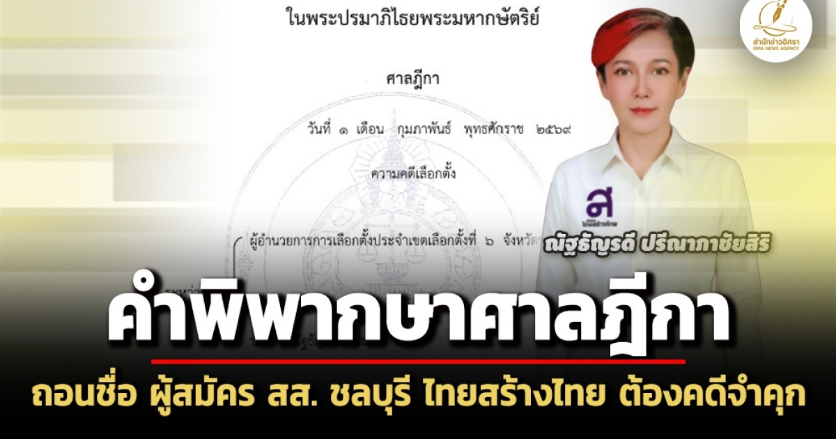 สำนักข่าวอิศรา www.isranews.org รายงานว่า ศาลฎีกามีคำสั่งเมื่อ วันที่ 1 เดือนกุมภาพันธ์ 2569 ให้ถอนชื่อนางสาวณัฐธัญรดี ปรีณาภาชัยสิริ ออกจากประกาศรายชื่อผู้สมัครรับเลือกตั้งสมาชิกสภาผู้แทนราษฎรแบบแบ่งเขตเลือกตั้ง เขตเลือกตั้งที่ 6 จังหวัดชลบุรี ของพรรคไทยสร้างไทย เนื่องจาก เคยได้รับโทษจําคุกโดยได้พ้นโทษมายังไม่ถึงสิบปีนับถึงวันเลือกตั้งจึงมีลักษณะต้องห้ามมิให้ใช้สิทธิสมัครรับเลือกตั้งตามบทบัญญัติแห่งรัฐธรรมนูญแห่งราชอาณาจักรไทย มาตรา 98(7)และพระราชบัญญัติประกอบรัฐธรรมนูญว่าด้วยการเลือกตั้งสมาชิกสภาผู้แทนราษฎร พ.ศ. 2561 มาตรา 42 (9) ตามคำร้องขอผู้อํานวยการการเลือกตั้งประจําเขตเลือกตั้งที่ 5 จังหวัดชลบุรี รายละเอียดดังนี้