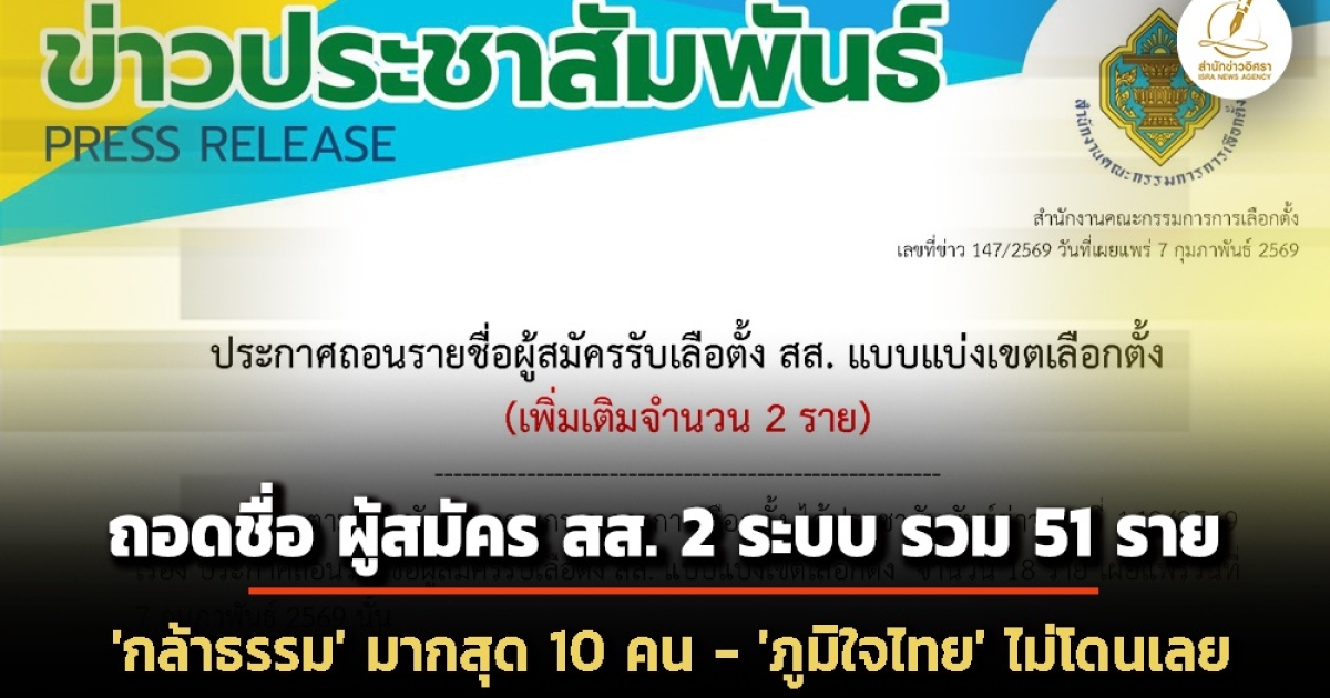 'กกต.' เผย 'ศาลฎีกา' ถอนชื่อผู้สมัครรับเลือกตั้ง สส.เขต เพิ่ม 2 ราย รวมทั้งสองระบบ ผู้สมัคร สส.เขต-ผู้สมัคร สส. ปาร์ตี้ลิสต์ ทั้งสิ้น 51 ราย 'กล้าธรรม' มากที่สุด 10 คน - 'ภูมิใจไทย' ยังไม่ถูกถอนชื่อแม้แต่คนเดียว