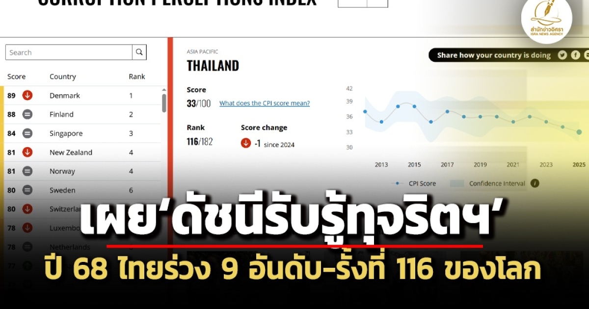 เมื่อวันที่ 10 ก.พ. องค์กรเพื่อความโปร่งใสนานาชาติ (Transparency International : TI) เปิดเผยผลสำรวจดัชนีการรับรู้การทุจริตหรือคอร์รัปชัน Corruption Perception Index: CPI) ประจำปี 2568 โดยประเทศไทยได้คะแนน 33 คะแนน จาก 100 คะแนน ลดลง 1 คะแนน จากปีก่อน (ปี 2567 ประเทศไทยได้ 34 คะแนน) และอยู่ในอันดับที่ 116 จากประเทศทั้งหมด 182 ประเทศ ลดลงจาก 9 อันดับ จากปีที่แล้ว (ปี 2567) ที่ไทยอยู่อันดับที่ 107 ของโลก