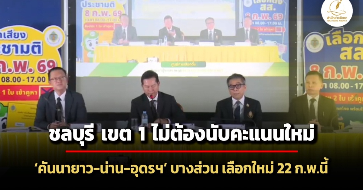 สำนักข่าวอิศรา (www.isranews.org) รายงานว่า วันที่ 12 กุมภาพันธ์ 2569 ที่สำนักงานคณะกรรมการเลือกตั้ง (กกต.) นายณรงค์ กลั่นวารินทร์ ประธาน กกต. พร้อมด้วย นายแสวง บุญมี เลขาธิการ กกต. และ ว่าที่ ร.ต.ภาสกร สิริภคยาพร รองเลขาธิการ กกต. ร่วมกันแถลงผลการประชุมคณะกรรมการเลือกตั้ง กรณีการพิจารณาคำร้องขอให้นับคะแนนเลือกตั้งใหม่ในพื้นที่เขต 1 จังหวัดชลบุรี